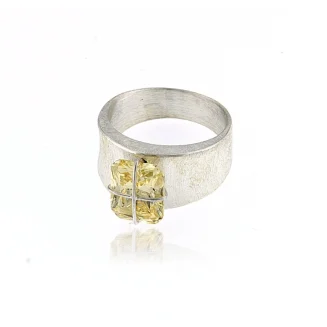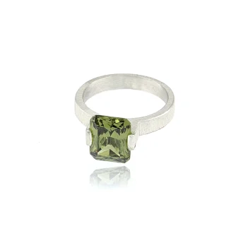 Sterling Silver with a soft matte finish, this beautiful Ring is made in Warsaw Poland. It comes it vibrant stone colors. Pictured are Yellow CZ, Peridot-Green, Blue-Topaz CZ, and Champagne CZ. Please specify size, color choice and whether you want stone set vertical or horizontal.