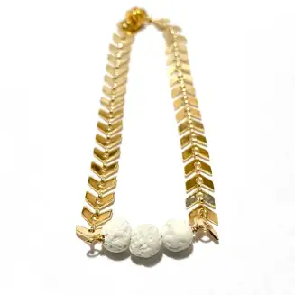 6.5″. Magnetic clasp. This aromatherapy bracelet with an extra strong magnetic clasp comes on gold plated ivy chain with white lava rocks. The lava stones are porous and allow you to put a drop of essential oil or perfume on and act as an aromatherapy diffuser.