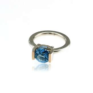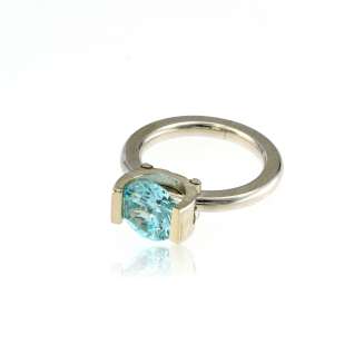 Contemporary Sterling Silver and 14K Yellow Gold with a 9mm Aqua CZ tension set. Made in Poland. Band has a matte finish