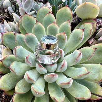 STERLING SILVER RING AND 14K GOLD BEZEL SET BLUE TOPAZ. Band is Textured with a leaf pattern . Band width is 9mm and Ring size is 7. Stone is a 10×12 faceted Blue Topaz