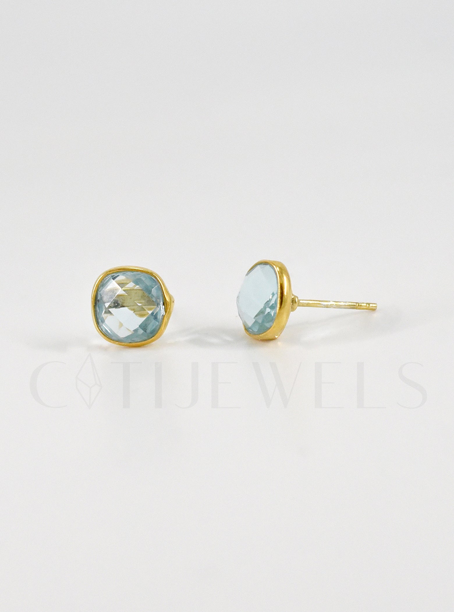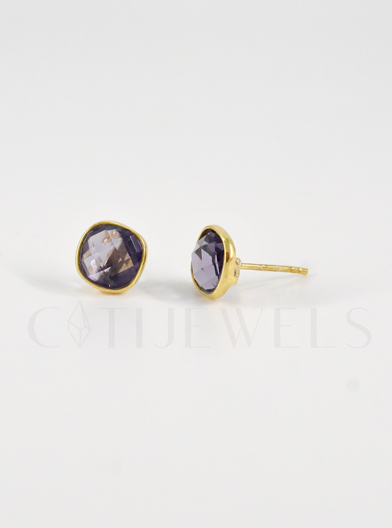 Post back earrings. Available in blue topaz or amethyst
