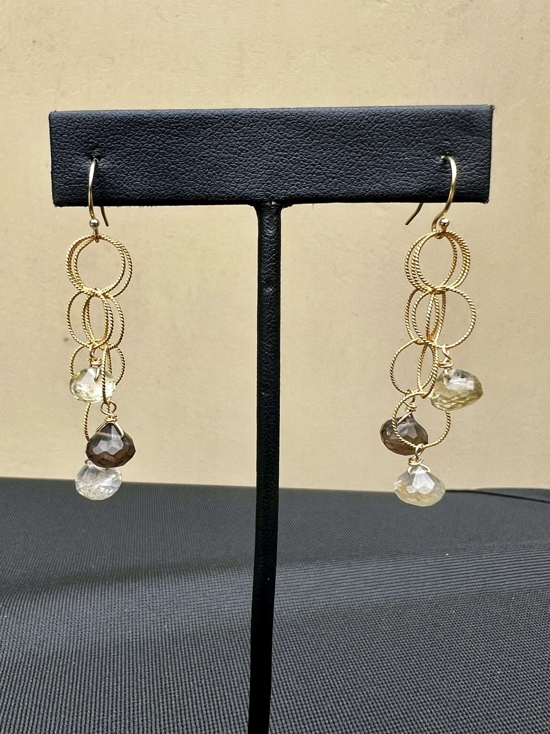 These Waterfall Earrings are made of 14K Gold Filled, Light and easy to wear and beautiful stones of smoky quartz, rainbow moonstone and prehnite, measures 2″ in length and beautiful for Fall!!