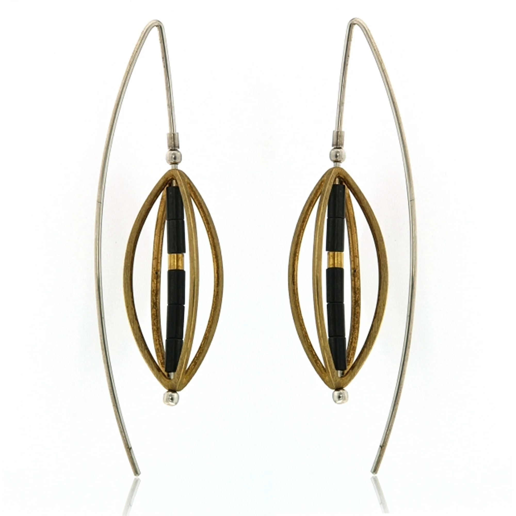 EARRINGS HEMATITE SILVER GOLD VERMEIL SPINNING MARQUISE, WIRE THREADER, 2 1/4″ long