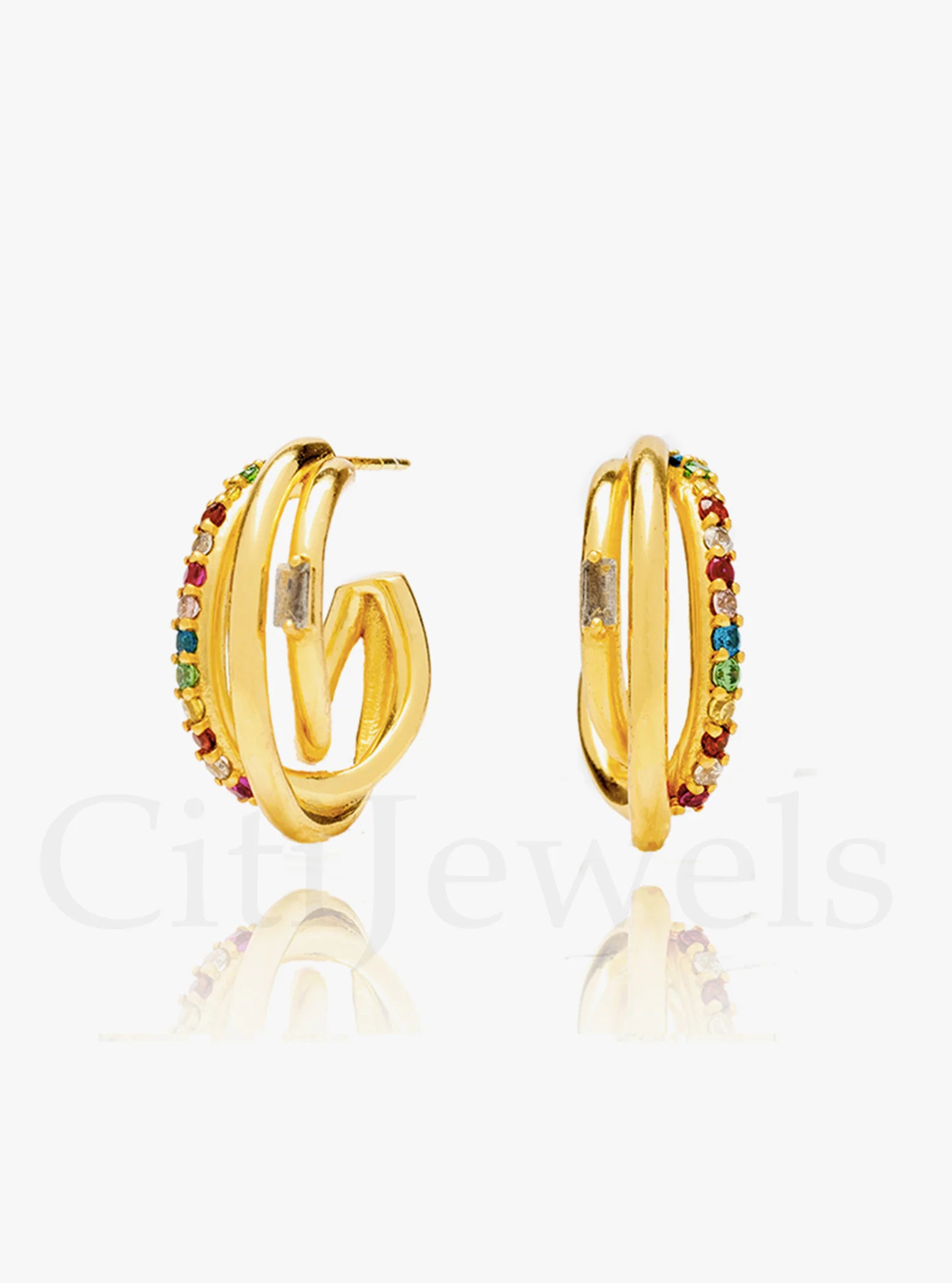 925 Silver With 14K Gold Vermeil Triple bar Multicolor Cz hoop Earrings. measure 14mm