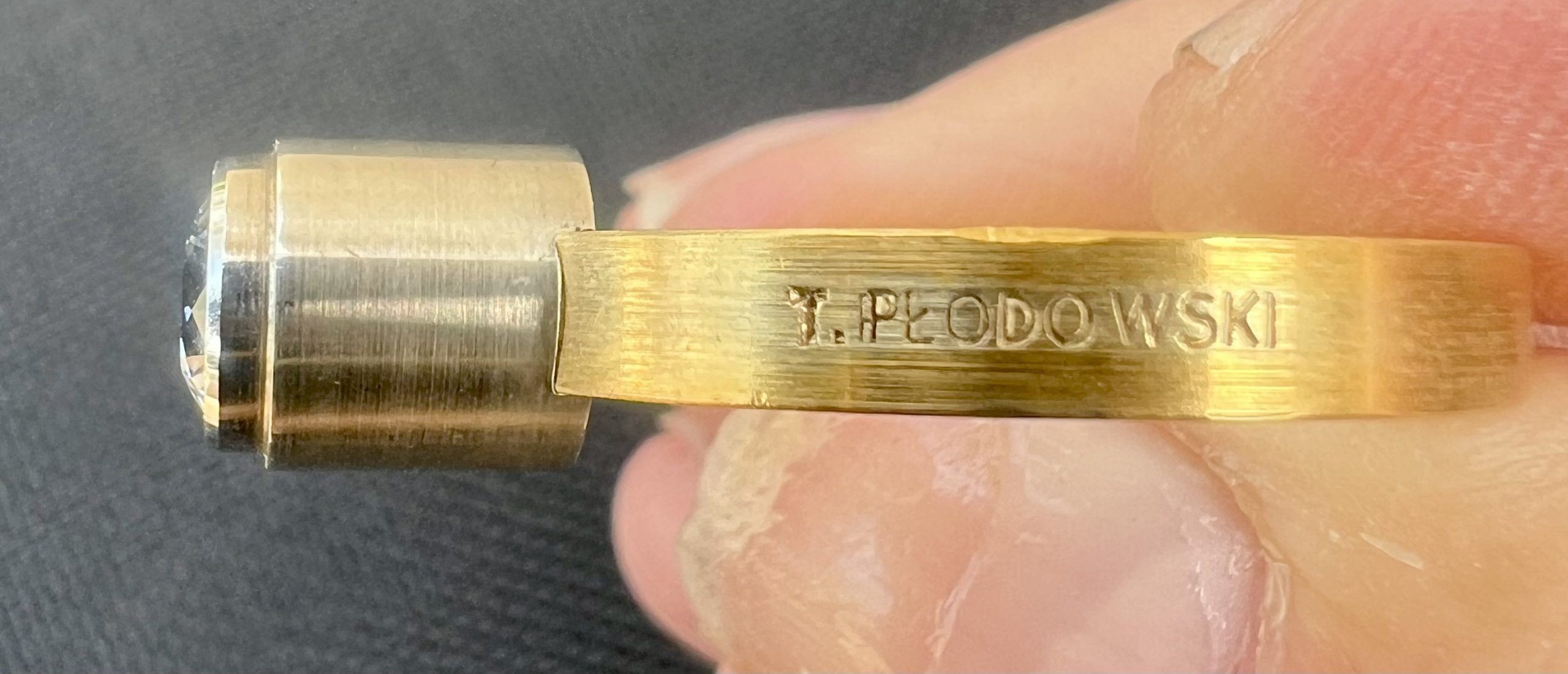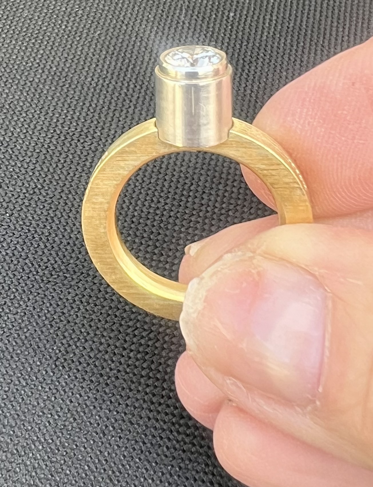 The stone is a 6mm round Cubic Zirconia bezel set in sterling silver and the band is 24K Gold Vermeil which gives it a deep rich color. Finish is a matte finish and signed by the artist. Made in Warsaw Poland.