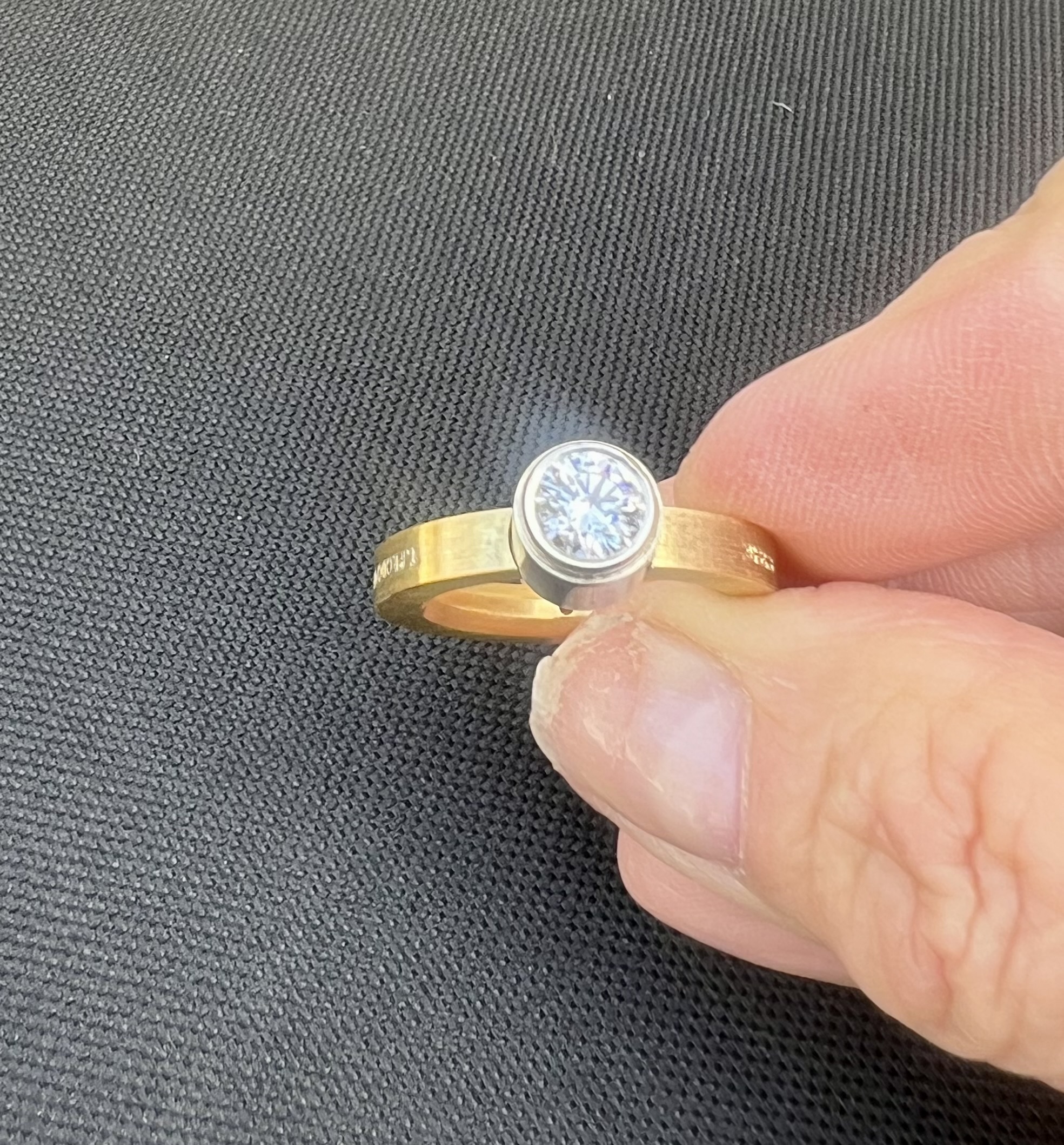 Bezel set 6mm white Cubic Zirconia in sterling Silver and 24k Gold Vermeil size 8 only