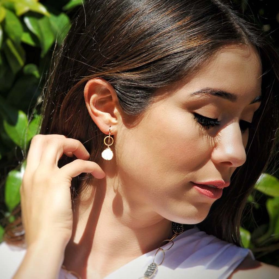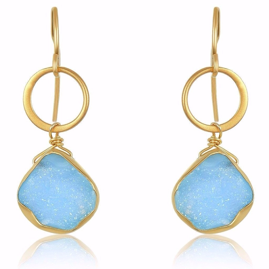 Matte gold-Vermeil open circles above your choice of blue, black, pink or white gold-plated bezeled druzy’s with the gold-filled ear.