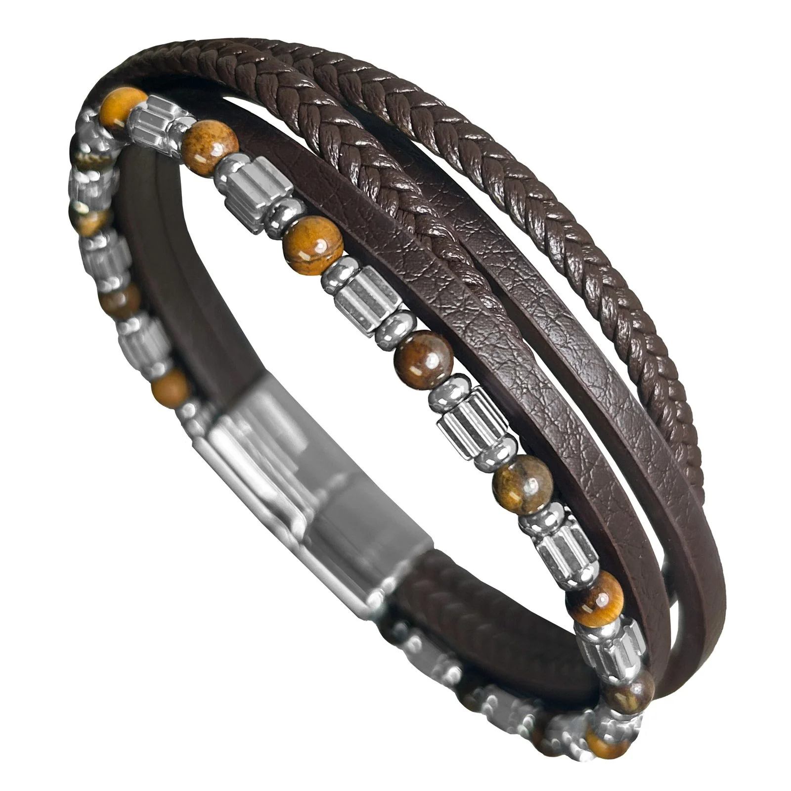 BROWN LEATHER WITH TIGER EYE AND STAINLESS STEEL BRACELET 8″