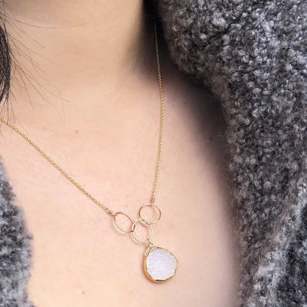 Bezel set white Druzy accented with three gold rings and finished with delicate gold filled chain