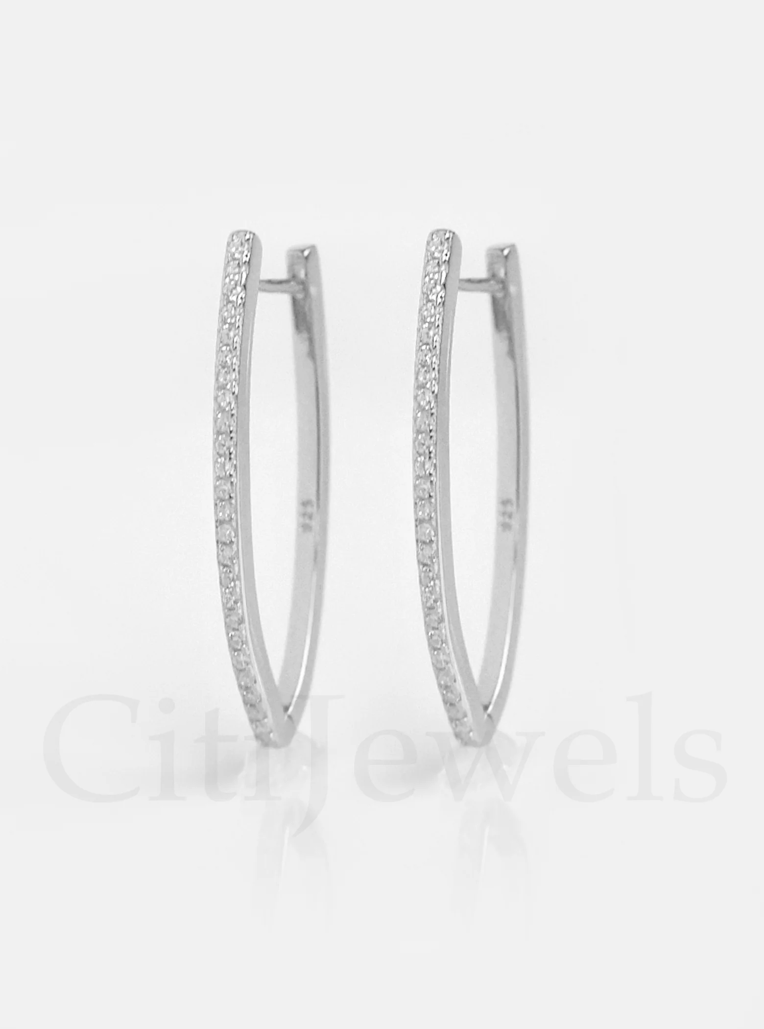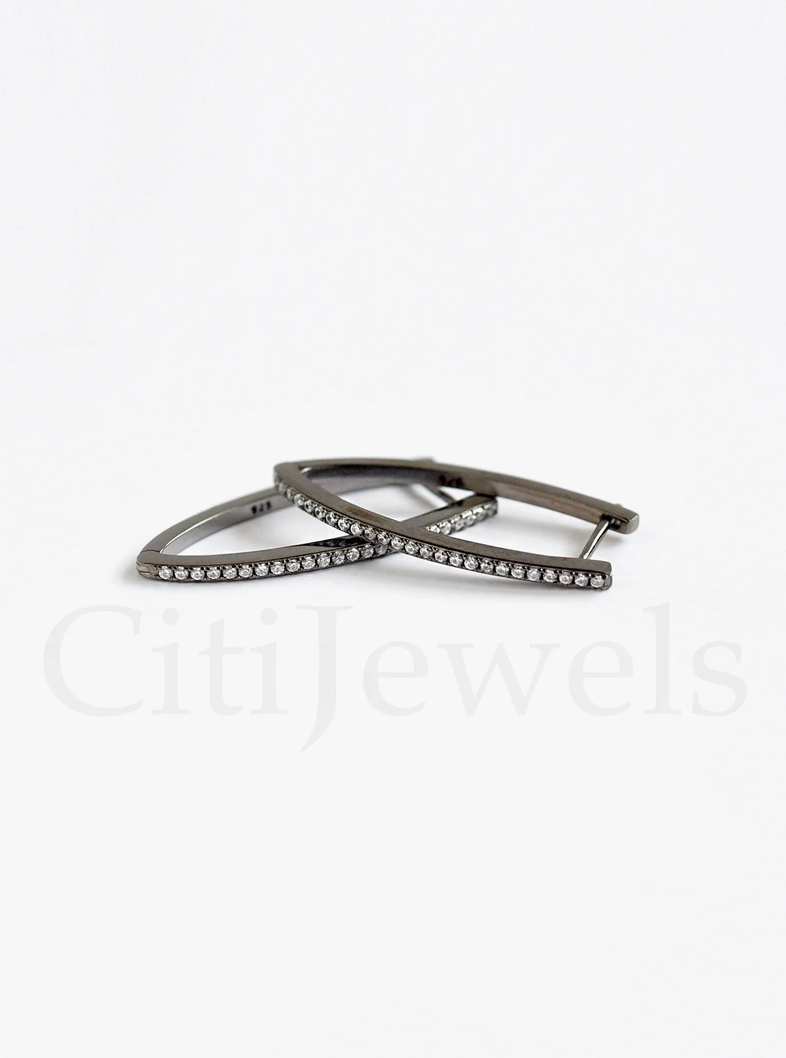 V SHAPE HUGGIE STYLE HOOP EARRINGS MEASURE 1′ IN LENGTH. THE CZ’S ARE PAVE SET IN FRONT. THEY ARE AVAILABLE IN STERLING SILVER, 14K YELLOW GOLD VERMEIL AND OXIDIZED SILVER.