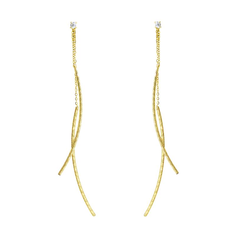 Diamond cut bars on delicate chain that flutter so lightly and feel weightless. Flatters every hair style. 14K yellow Gold Vermeil, the longer length is 4″ and the other is 3″ and connects from the back.