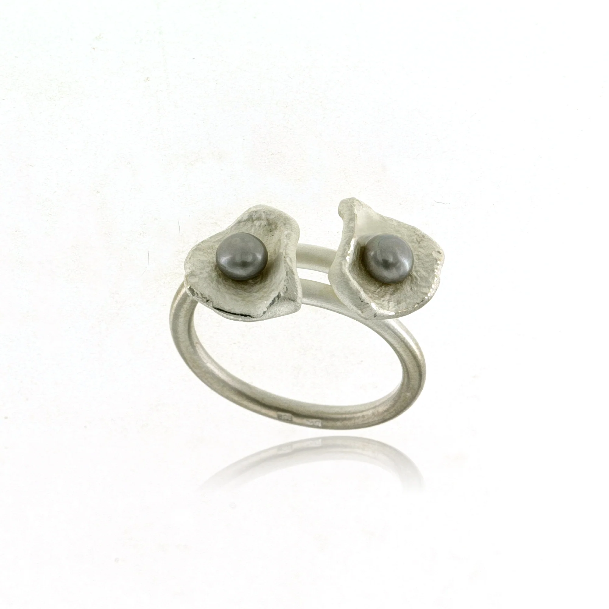 STERLING SILVER RING MATTE FINISH WITH 2 SMALL PETALS 7/16″, GREY FRESH WATER PEARLS