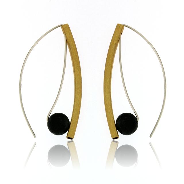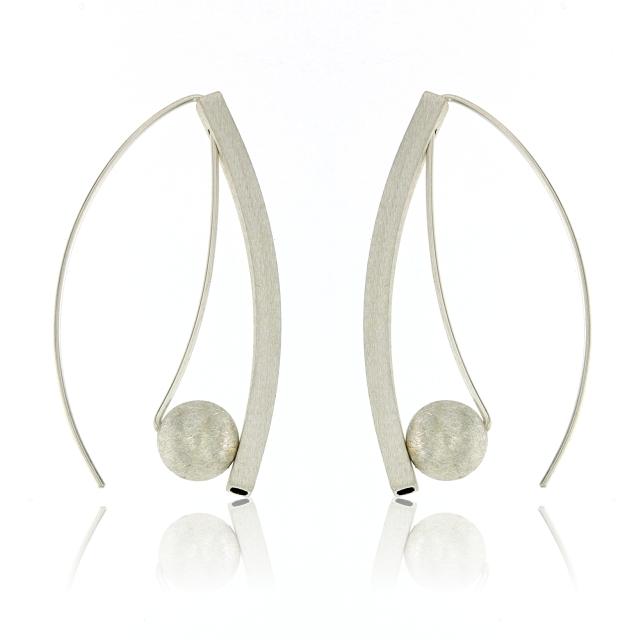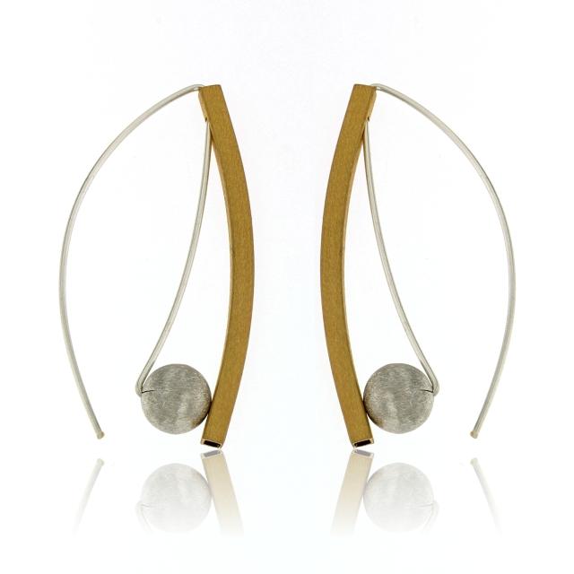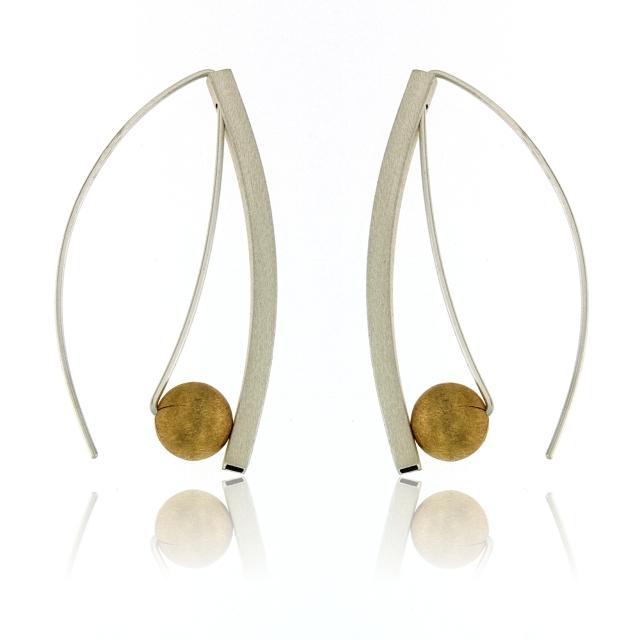 EARRINGS SILVER MATTE FINISH, CURVED BAR WITH GOLD PLATED BALL, WIRE, 2″