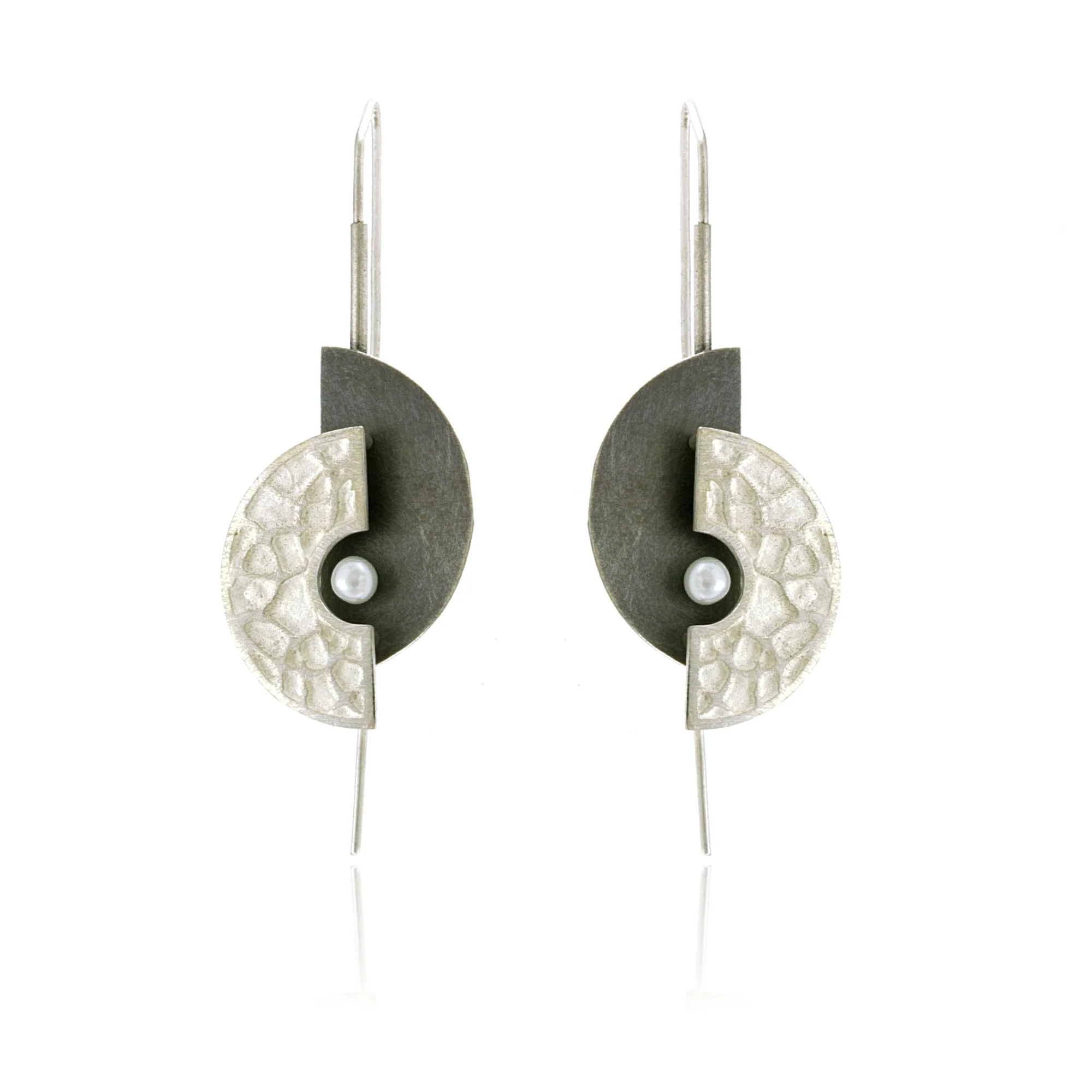 EARRINGS SILVER AND BLACK OXIDATION 2 SEMICIRCLES ON TOP OF ONE ANOTHER, WHITE FRESH-WATER PEARL 4mm, LONG THREADER, 2 1/2″