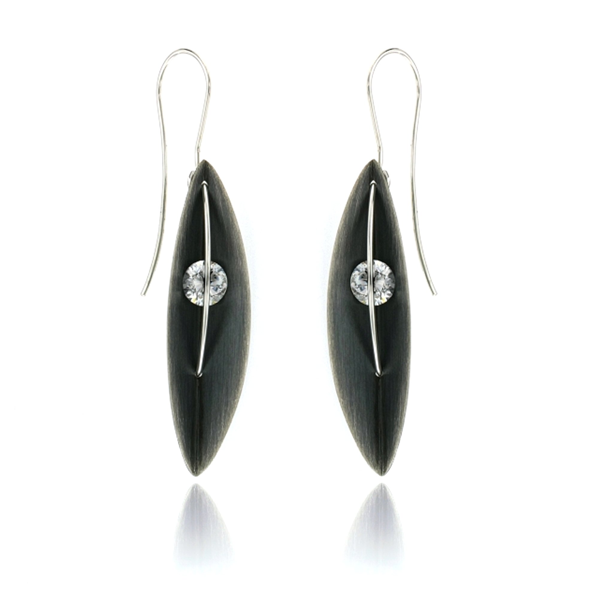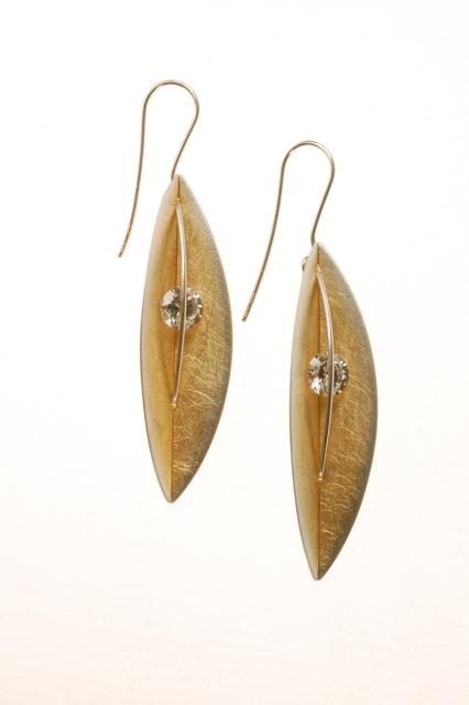 EARRINGS SILVER GOLD PLATED LEAF, CZ UNDER WIRE, WIRE, 2 3/8″