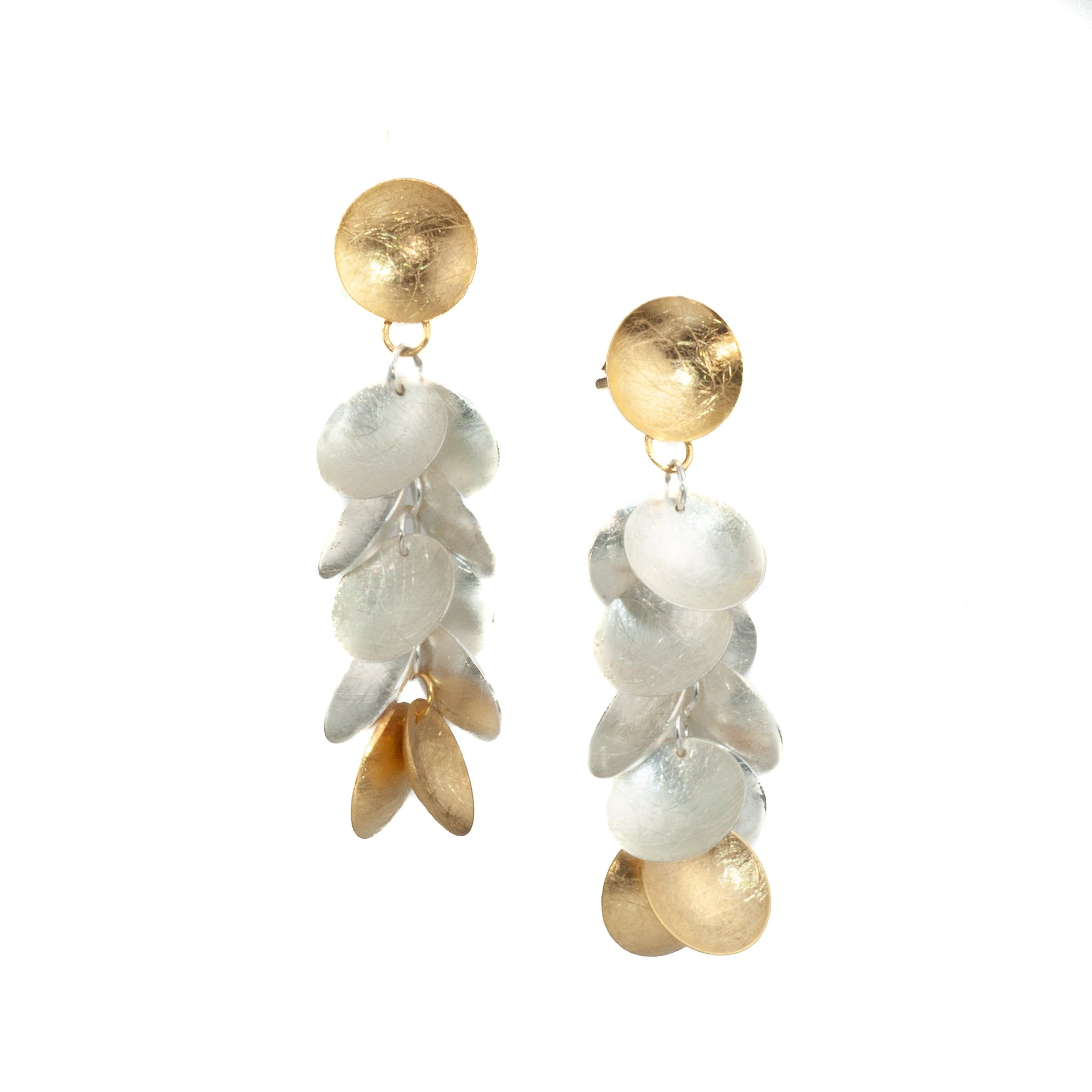 EARRINGS SILVER GOLD VERMEIL 2-TONE DISCS CLUSTER, POST, 1 3/4″