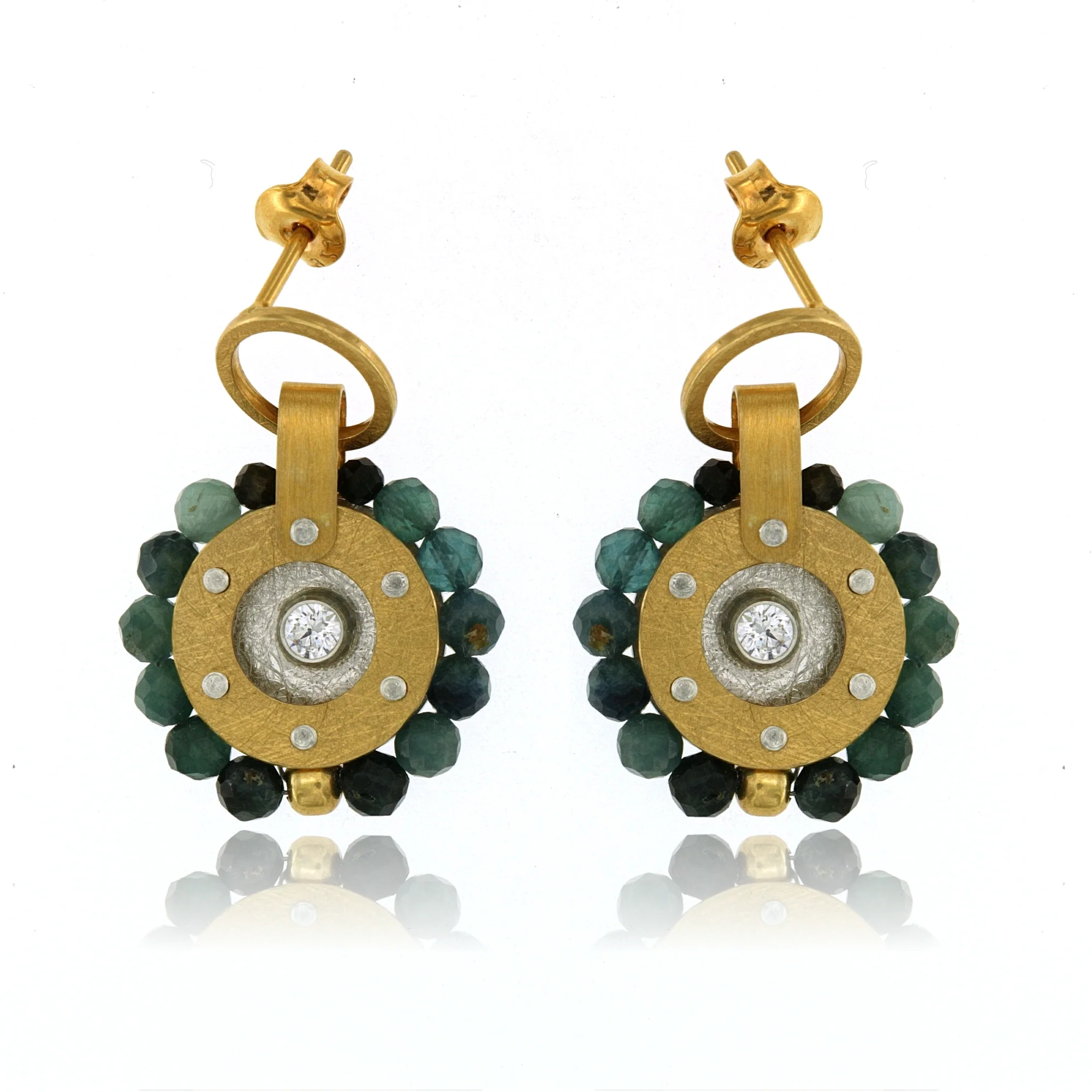 EARRINGS STERLING SILVER 24K GOLD PLATED GOLD CIRCLE W BLUE TOURMALINES AND CZ, POST, 1 1/8″