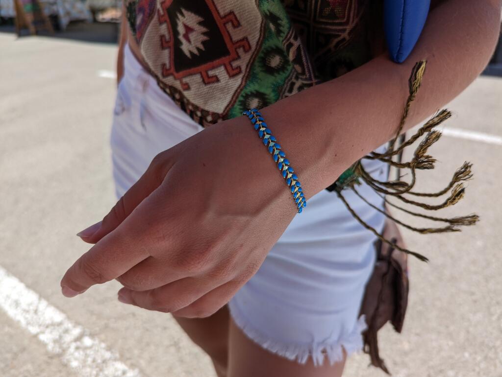 This bracelet with an extra strong magnetic clasp is beautiful blue enamel on gold plated ivy chain. 6.5″