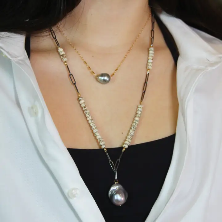 combination of oxidized sterling silver paperclip open link chain with natural beads that come from nuts in an asymmetrical style with a grey baroque pearl drop. Can be linked anywhere.