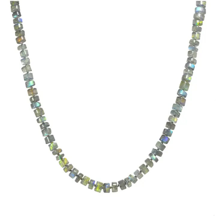 Beautiful labradorite heishi stones are hand knotted on silk thread to form this elegant everyday necklace. This is a perfect necklace to wear alone or pair with other chains or stone necklaces for the perfect “neck mess”.