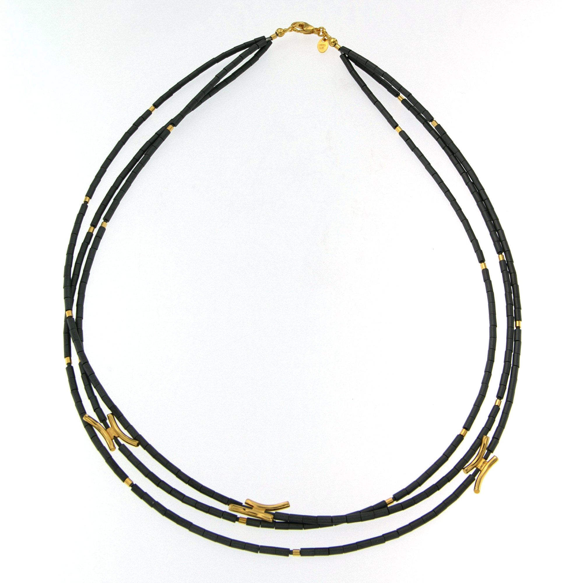 NECKLACE 3 STRANDS MATTE FINISH HEMATITE BEADS, GOLD VERMEIL OVER SILVER, 19″