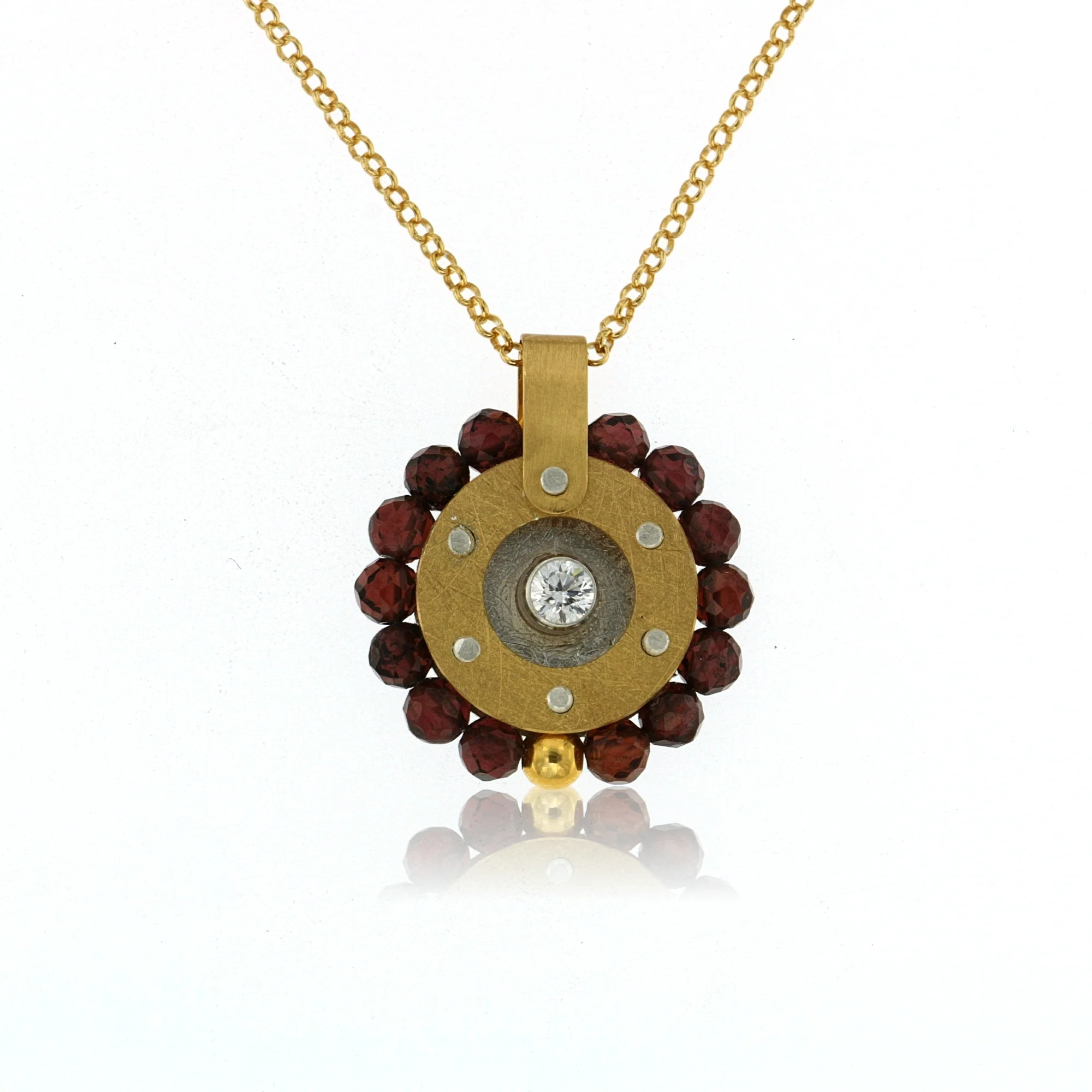 NECKLACE SILVER 24K GOLD VERMEIL, GOLD CIRCLE WITH GARNETS AND CZ PENDANT, CHAIN 17.5 “+ 2”