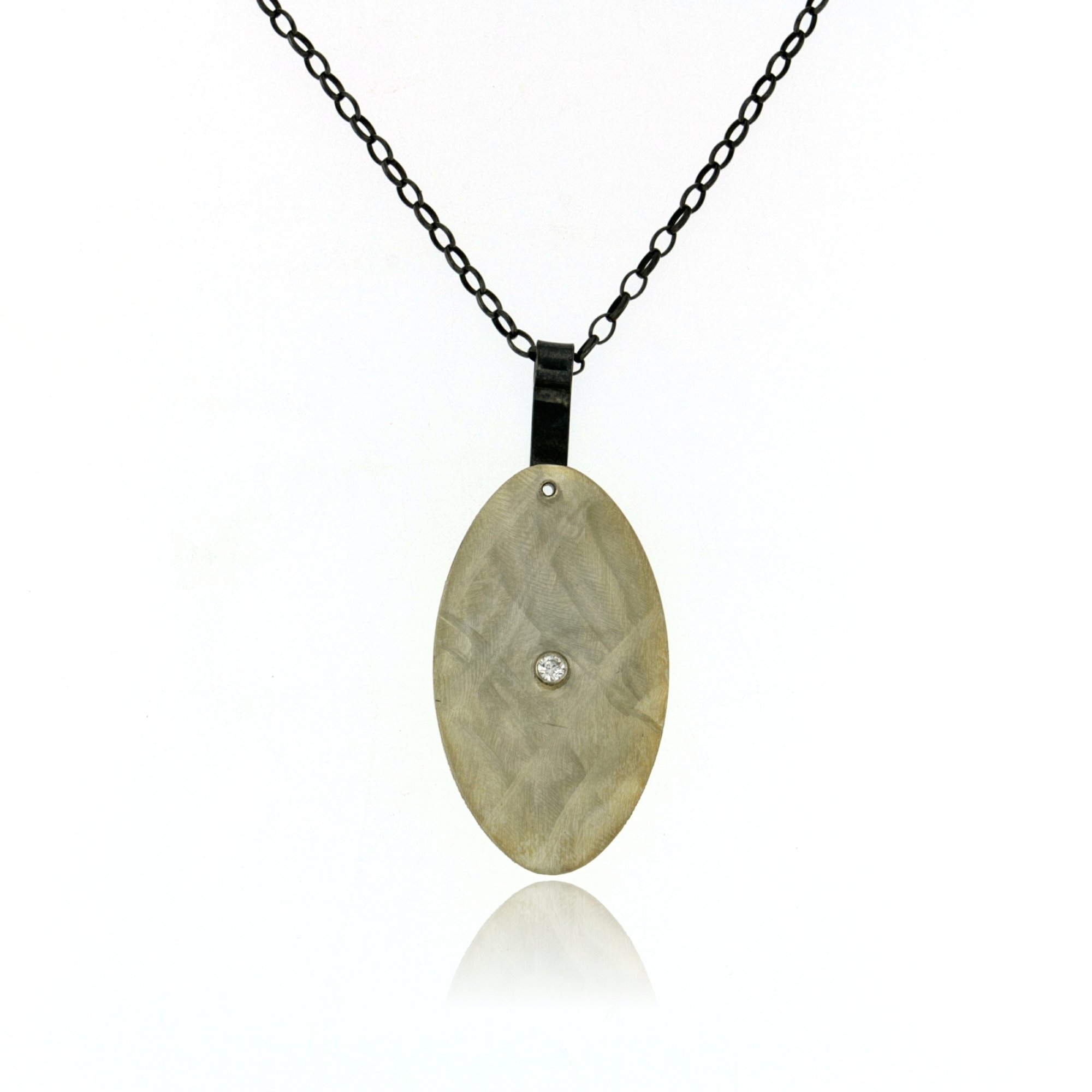 NECKLACE SILVER OVAL WITH CZ PENDANT 1 7/8″ WITH BRUSH STROKES FINISH, OXIDIZED SILVER CHAIN 31″