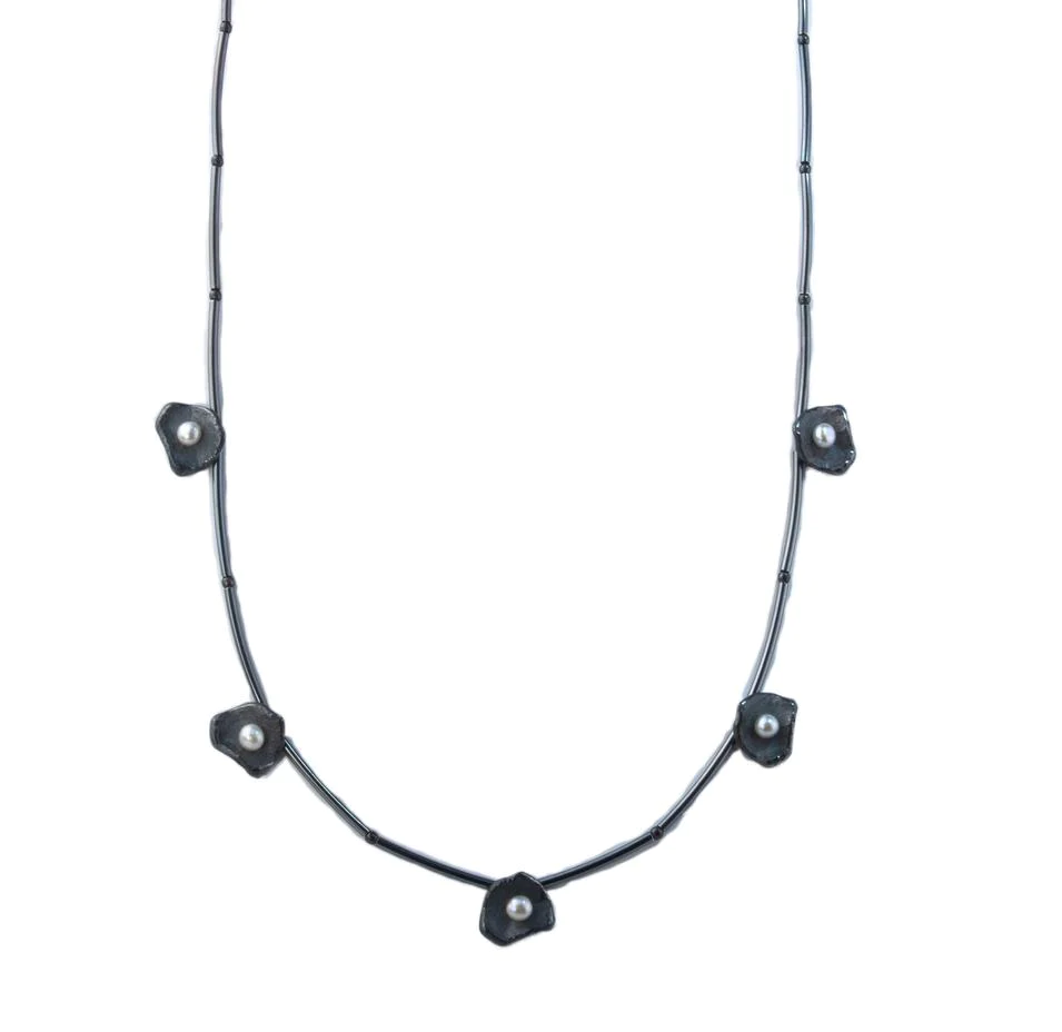 NECKLACE 5 OXIDIZED BLACK PETALS 7/16″, WHITE FRESHWATER PEARLS, OXIDIZED TUBES 18″