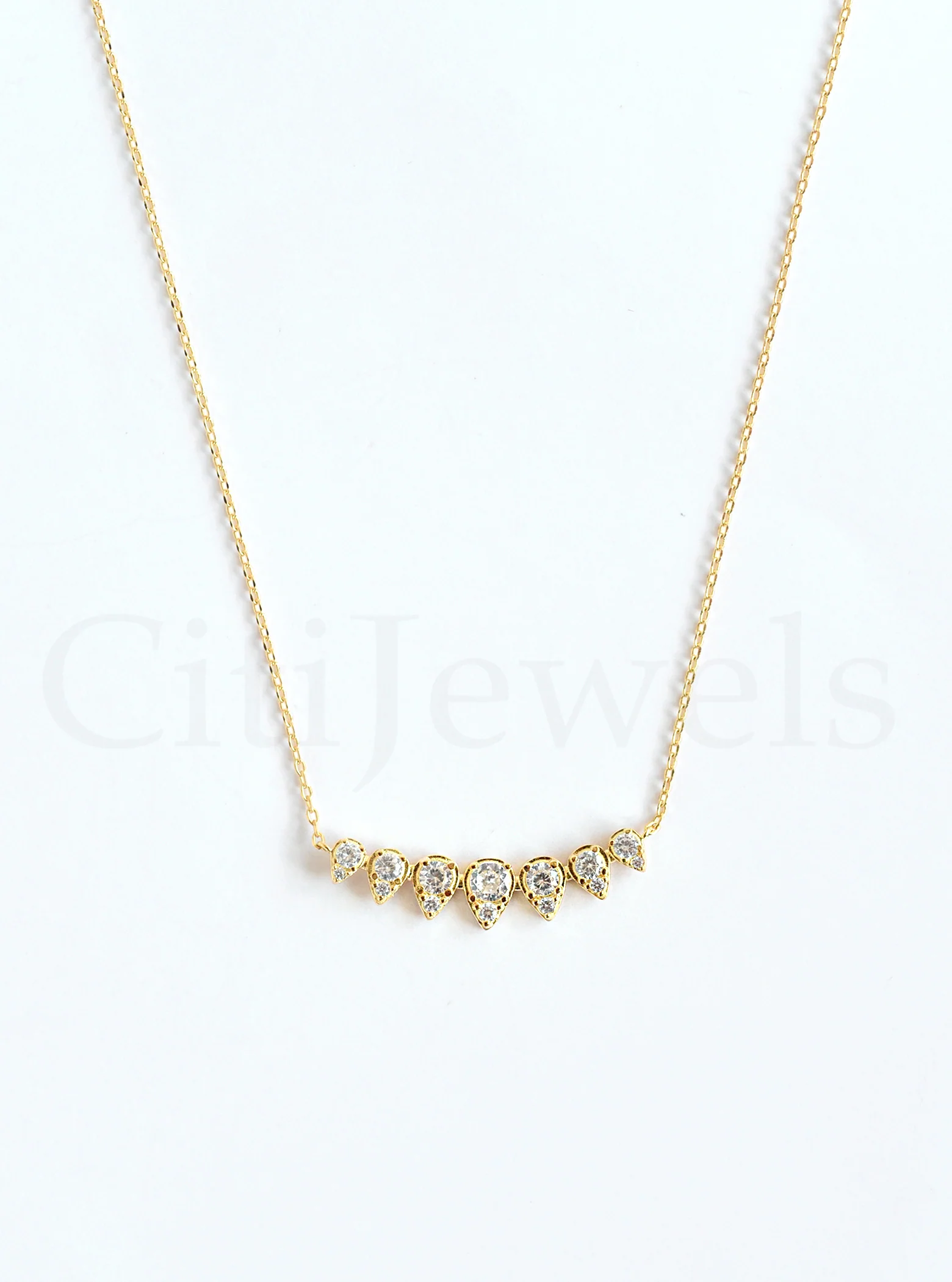 Beautiful Multi Teardrop CZ Bar Necklace 16″ + 2″ extender . Available in Sterling Silver and 14K Yellow Gold Vermeil.