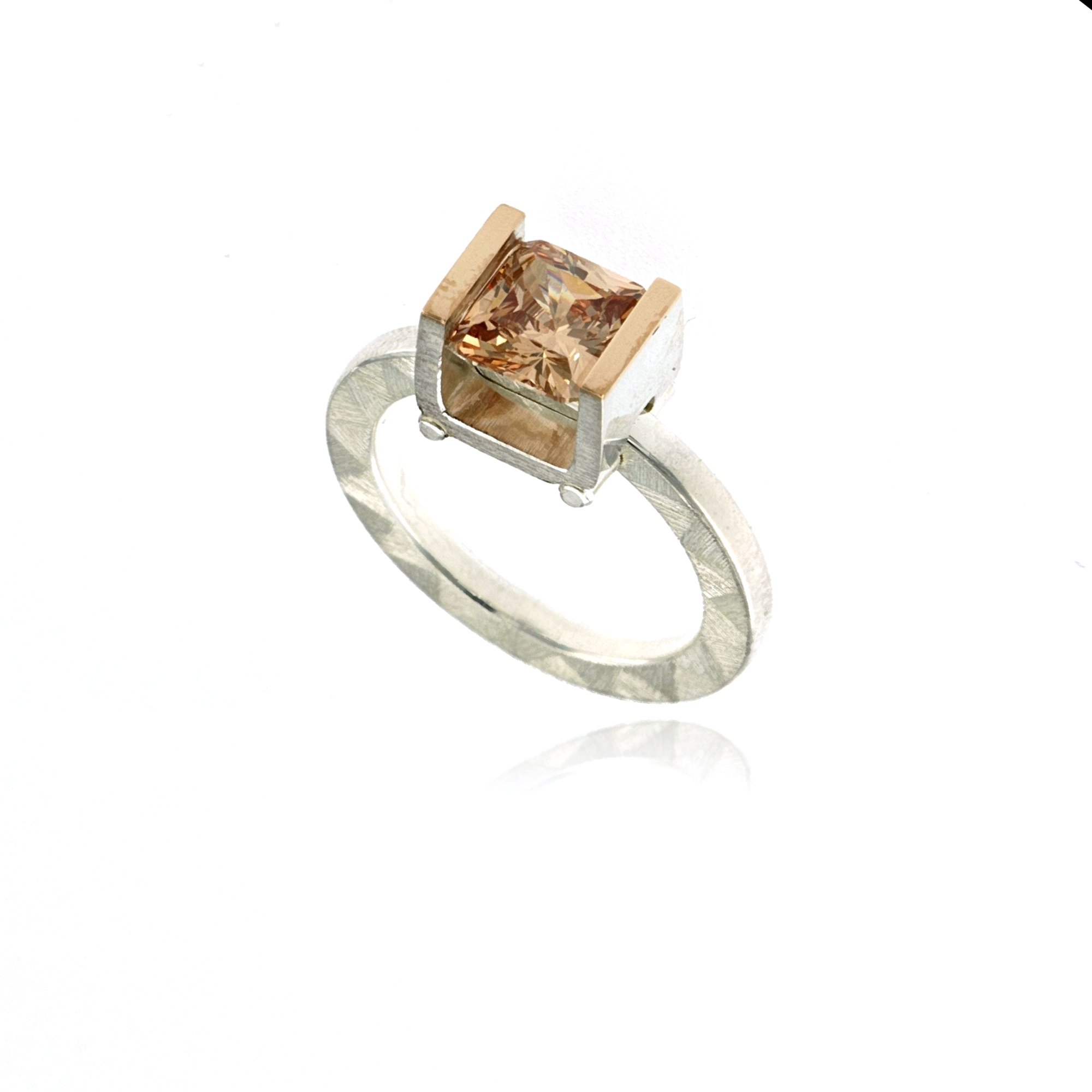 RING SILVER 14K GOLD 7x7mm CHAMPAGNE CZ TENSION SET, MOSAIC MATTE FINISH SIZE 6 ONLY