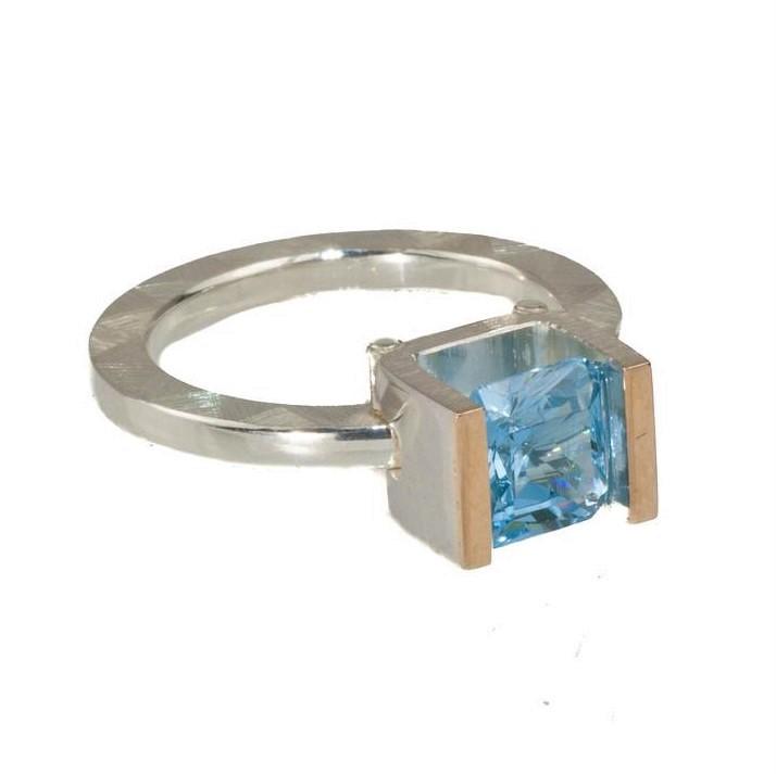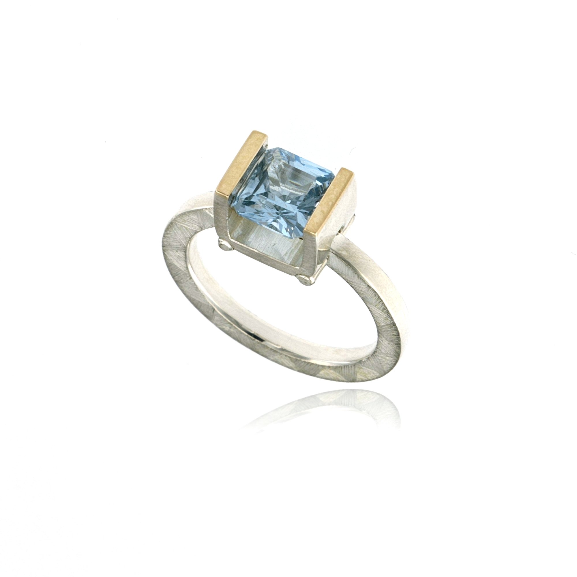 RING SILVER 14K GOLD 7x7mm SWISS BLUE CREATED SPINEL TENSION SET, MOSAIC MATTE FINISH SIZE 7 ONLY