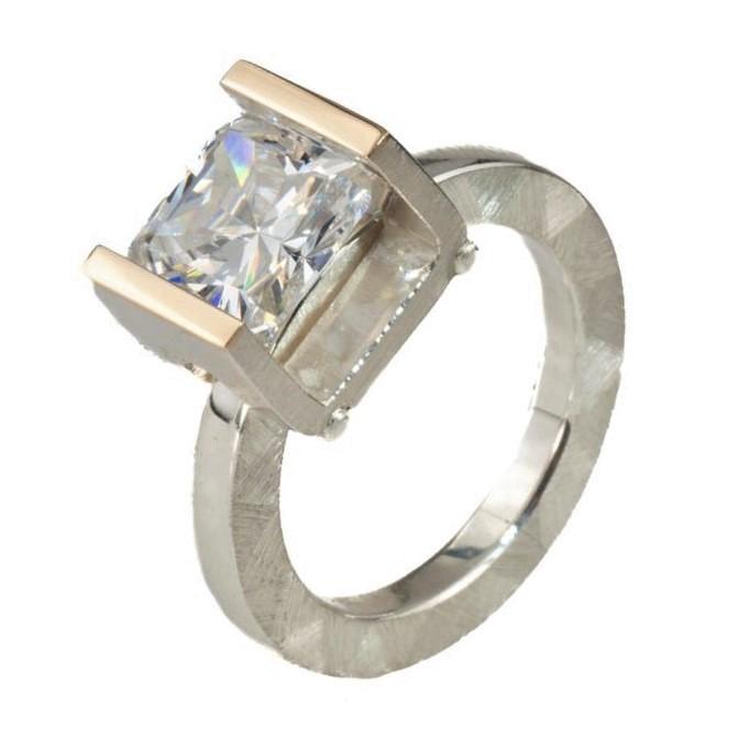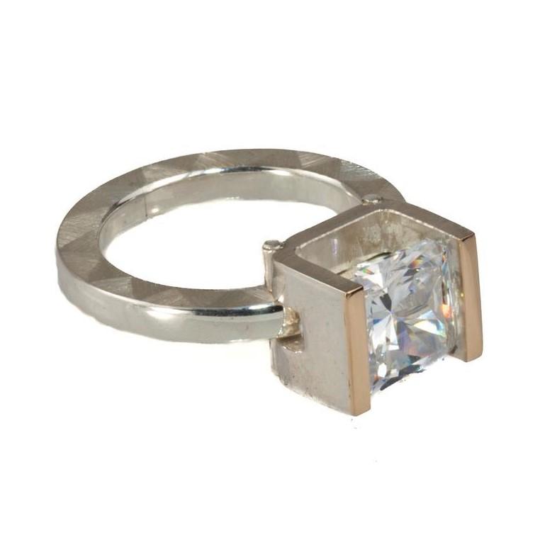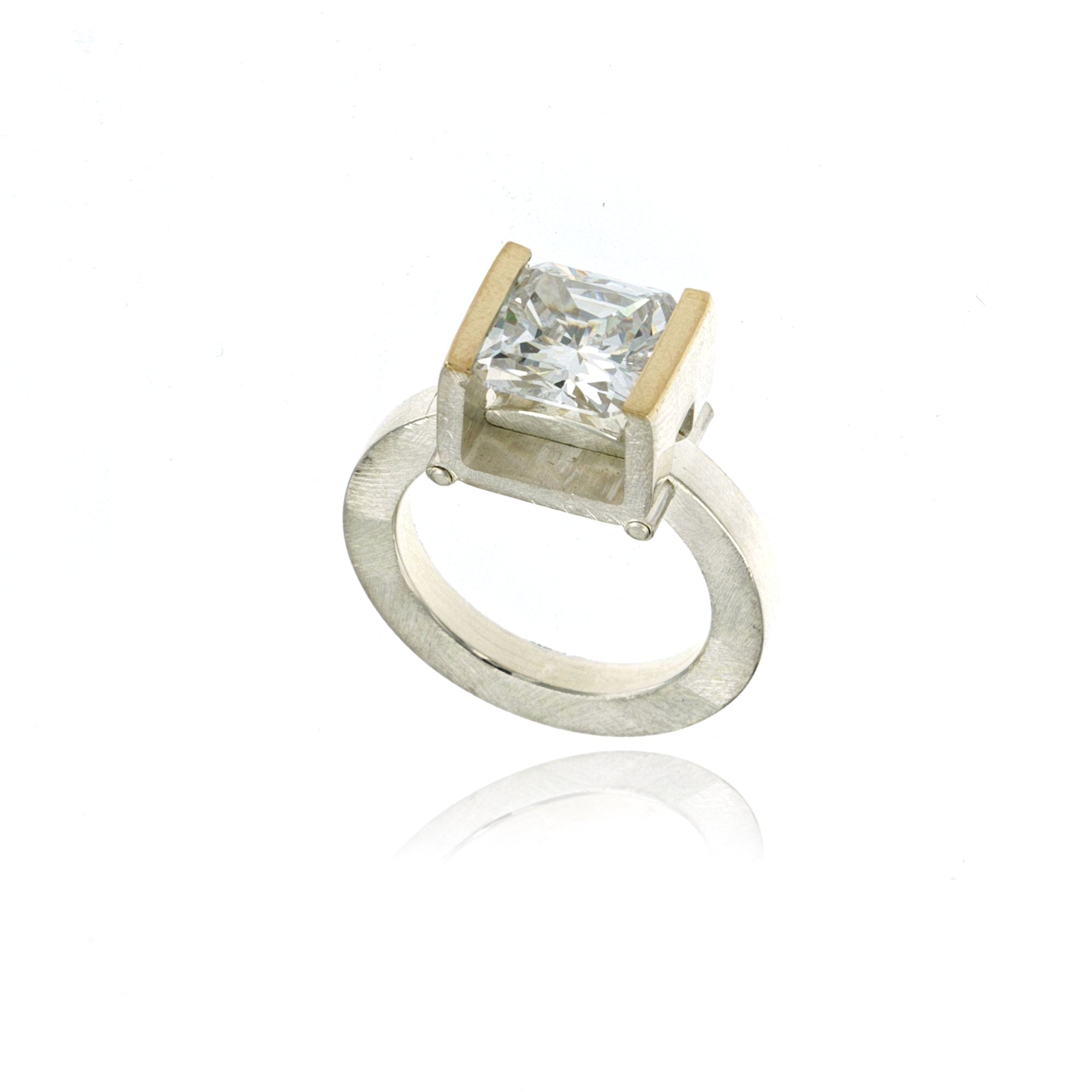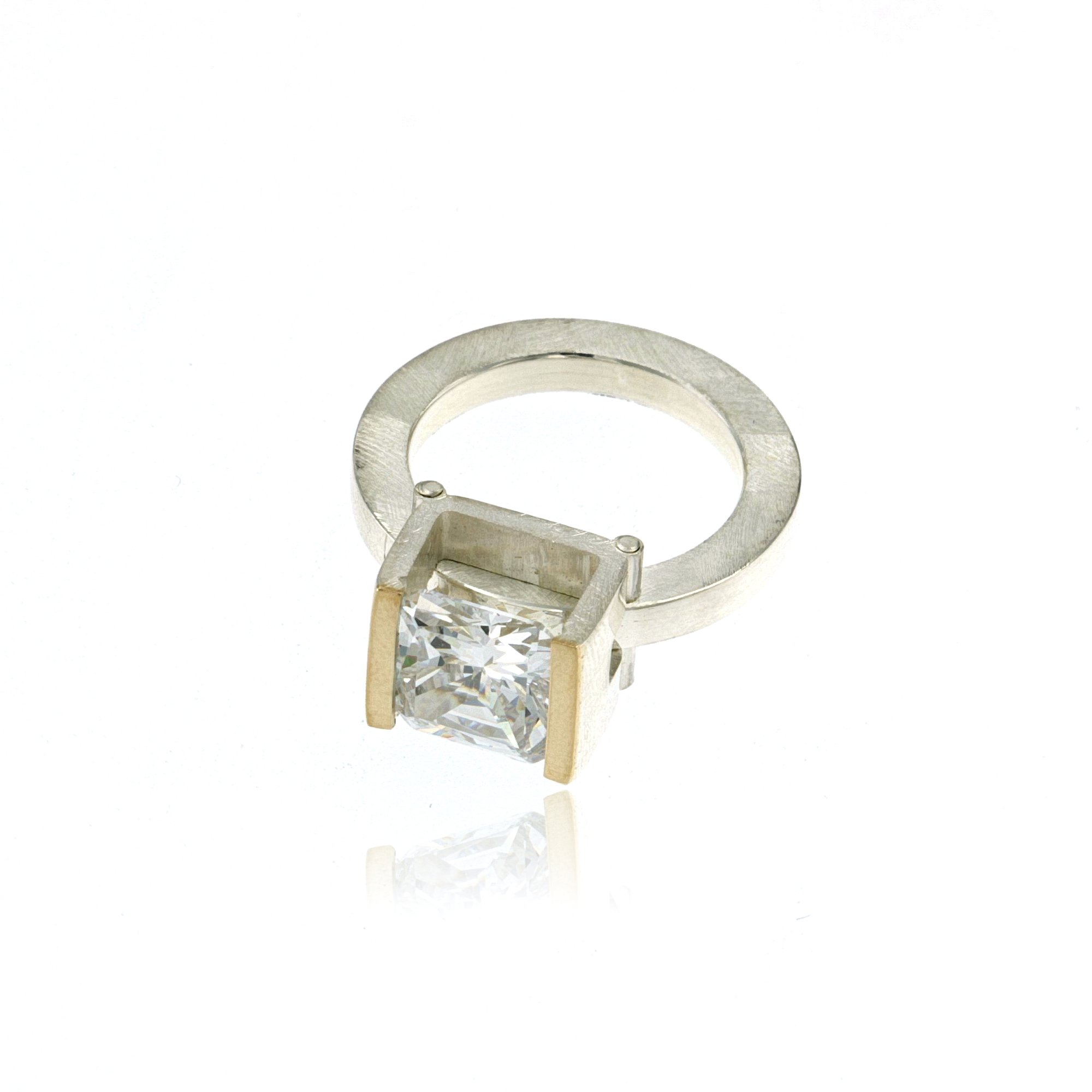 RING SILVER 14K GOLD 9x9mm CLEAR CZ TENSION SET, MOSAIC MATTE FINISH