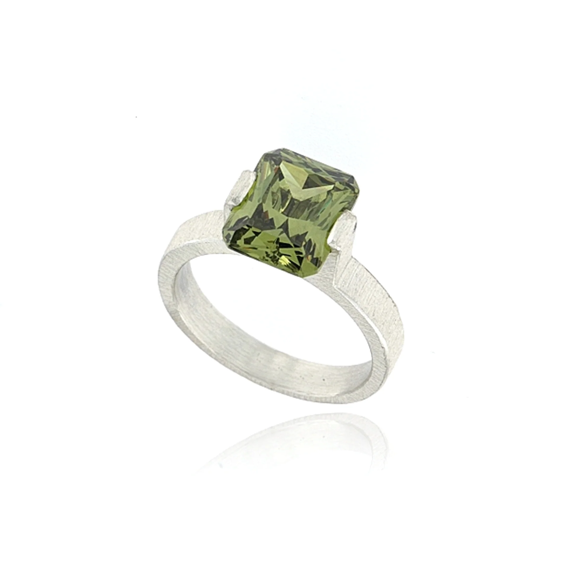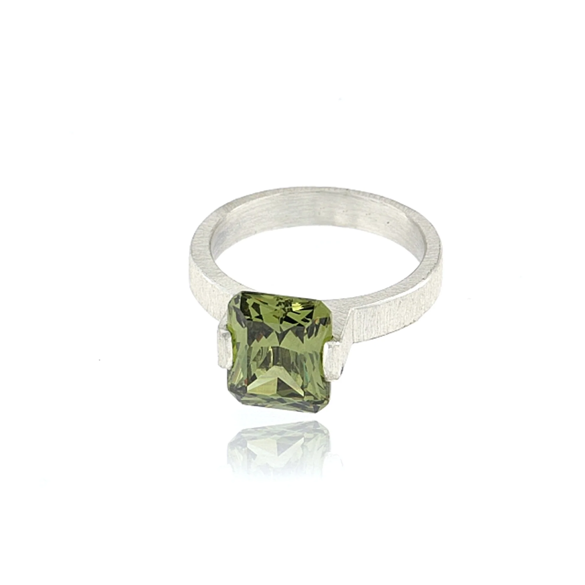 RING SILVER “SIMPLE” 10x8mm PERIDOT CZ SET HIGH ON TOP SIZE 6 ONLY