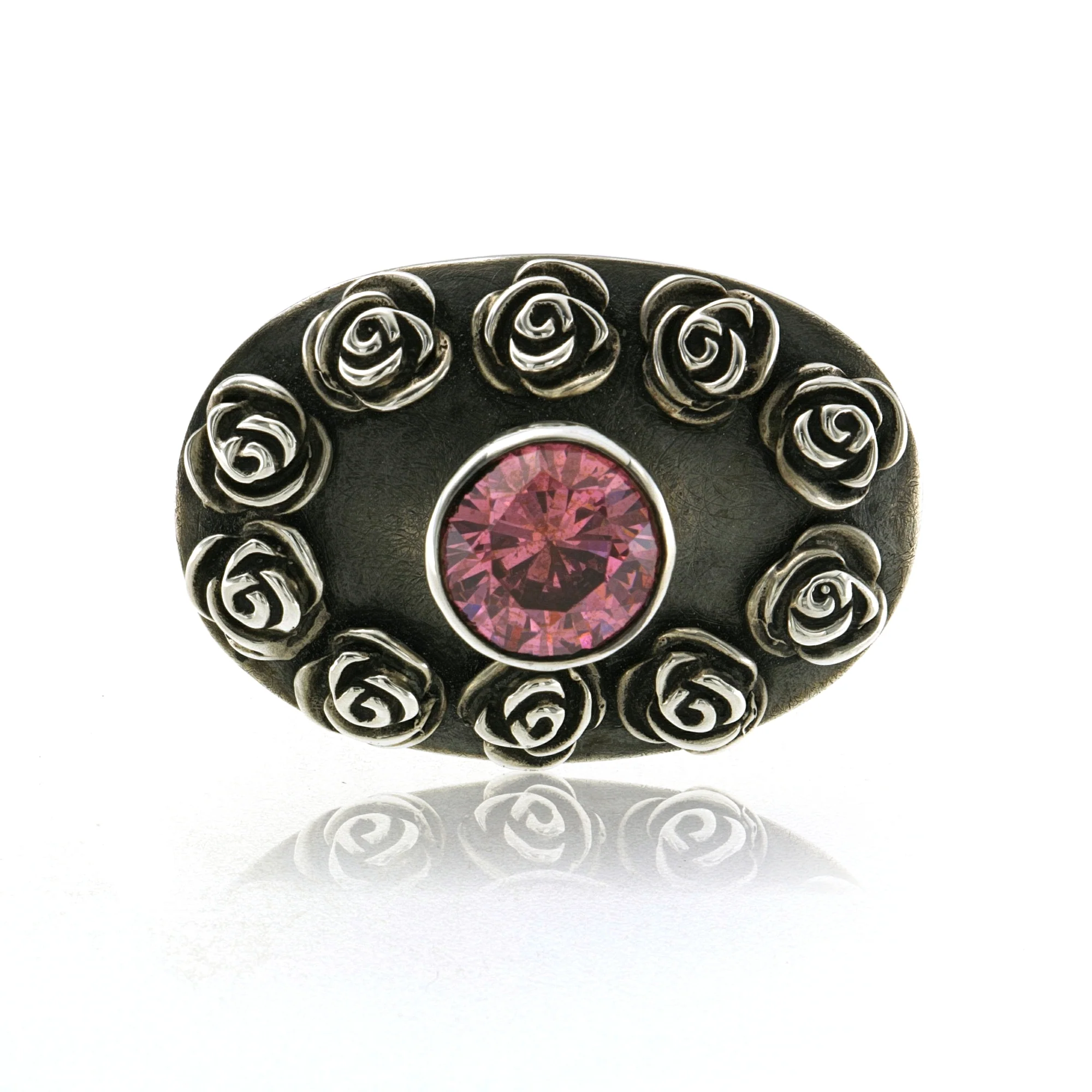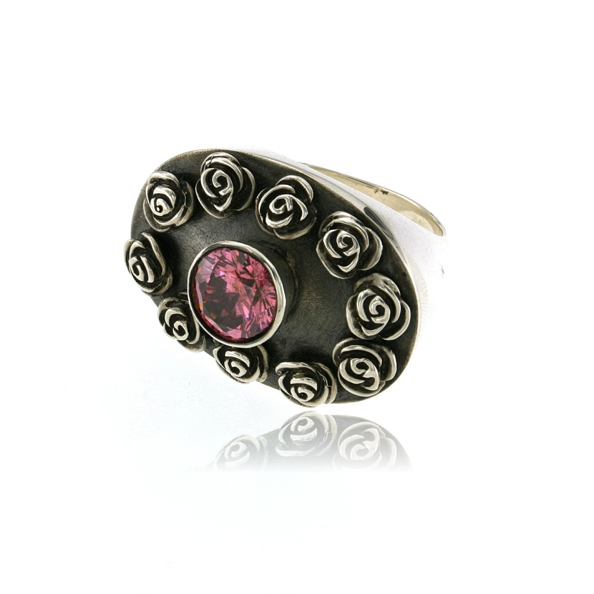 RING SILVER OXIDIZED BLACK, SMALL ROSES, 10mm PINK CZ BEZEL SET, s. 10.5