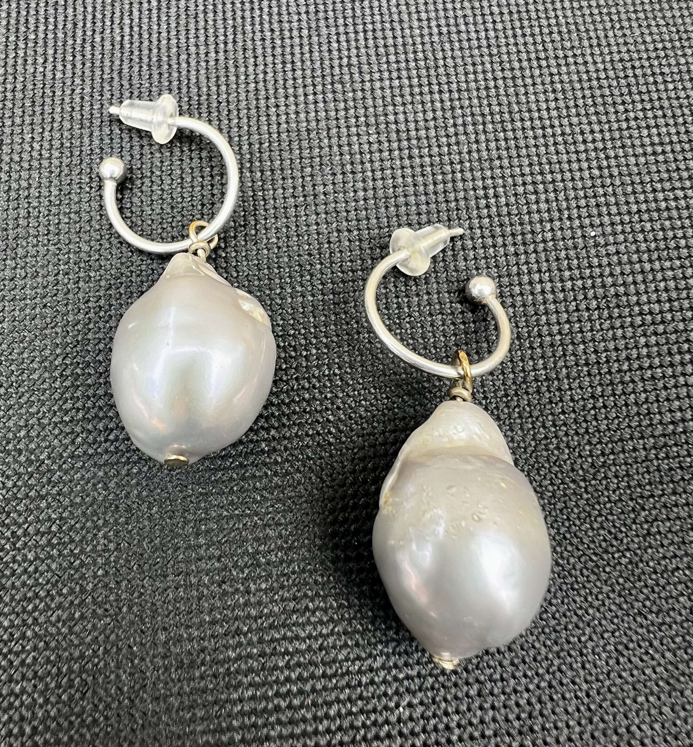 SOUTH SEA SILVER GREY PEARLS ARE 18mm by 13mm in size dangle from a Sterling Silver Hoop that measures 14mm ONE OF A KIND LAST PAIR