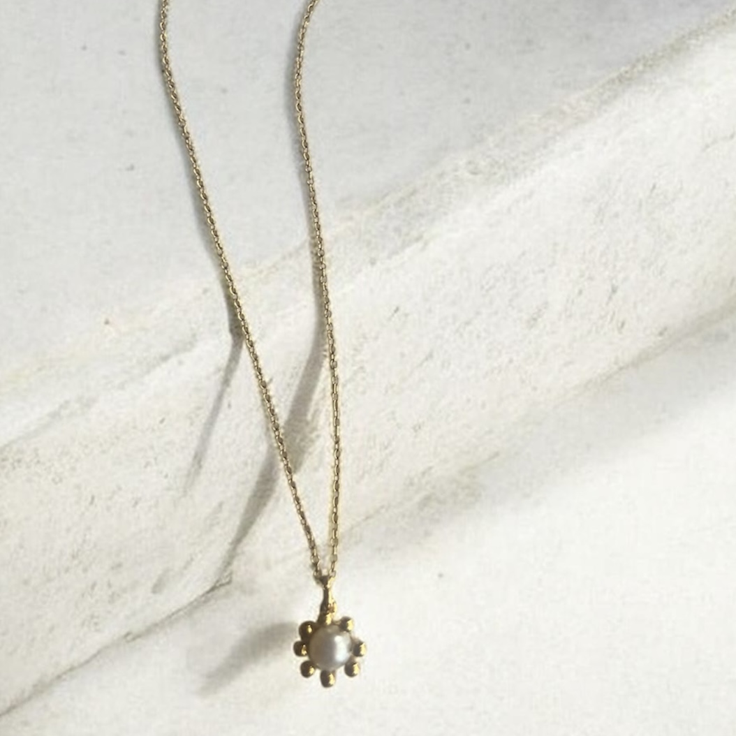 Petite Gold Vermeil starburst setting with freshwater pearl on a 16” + 2” length chain