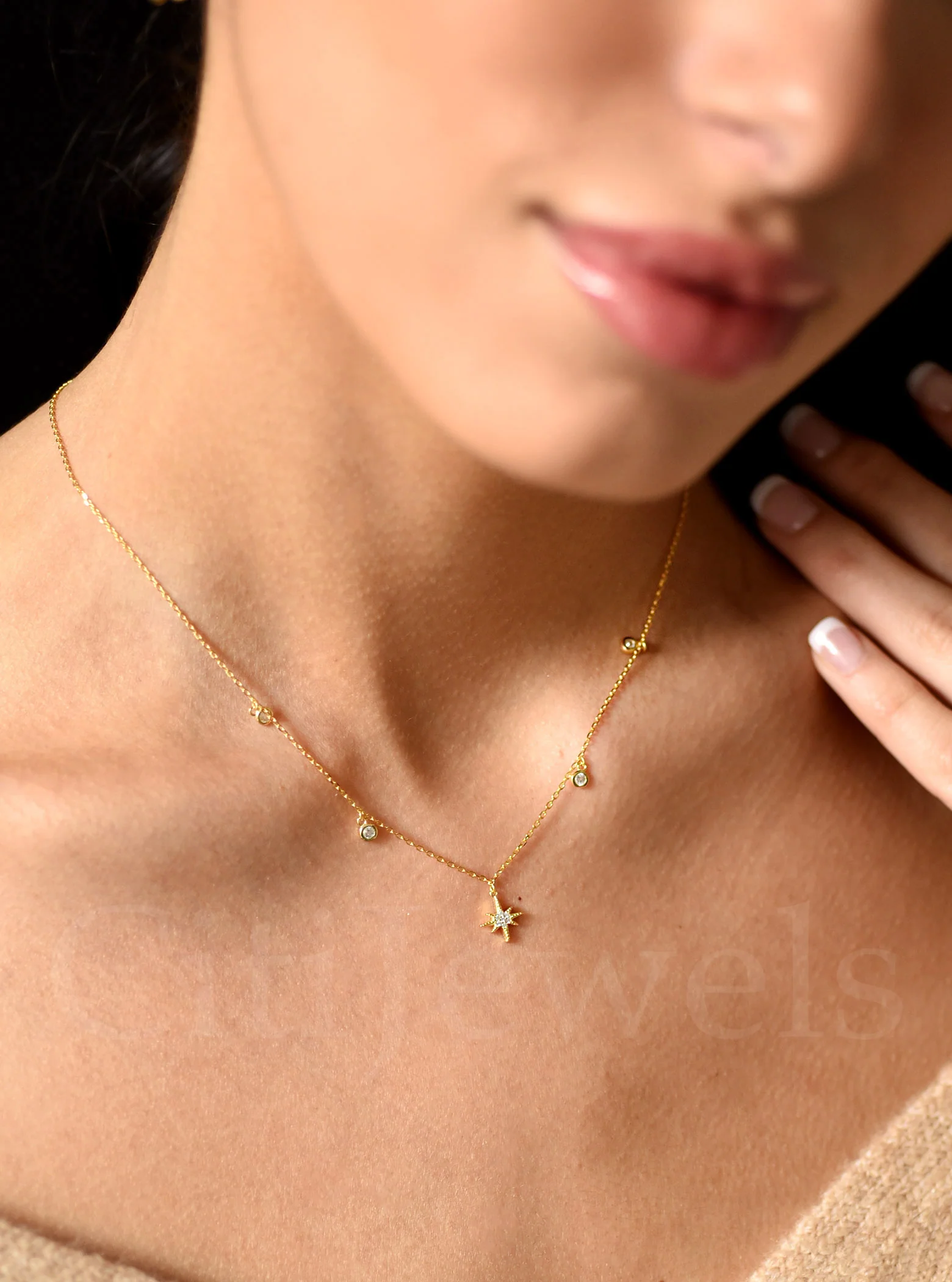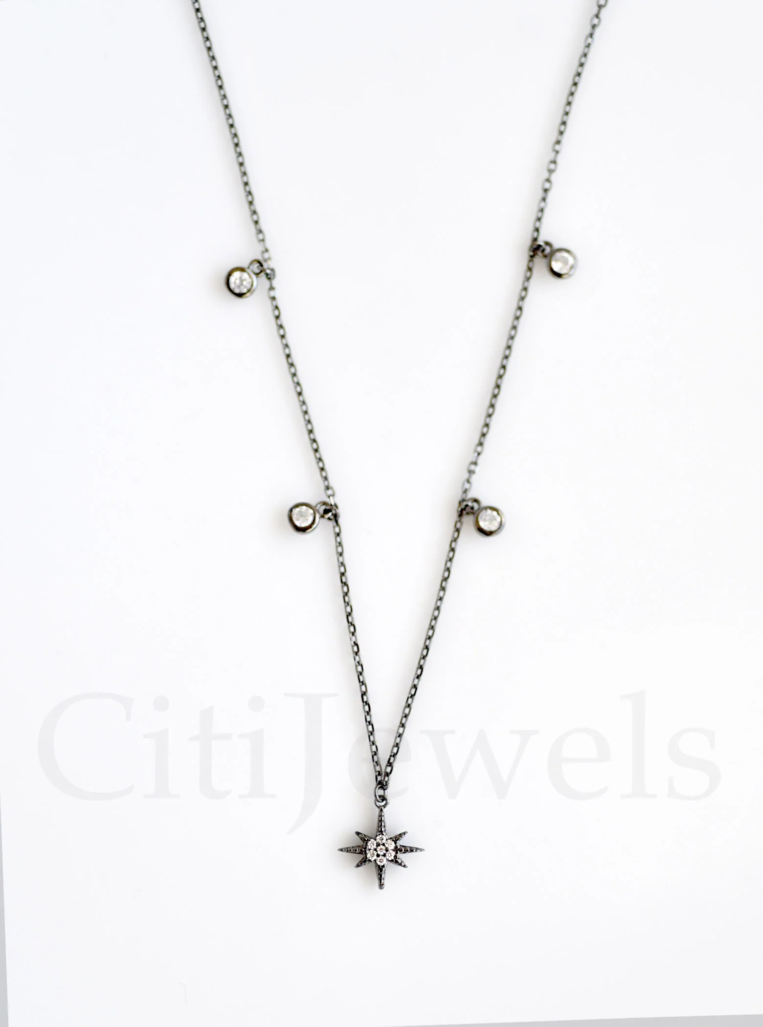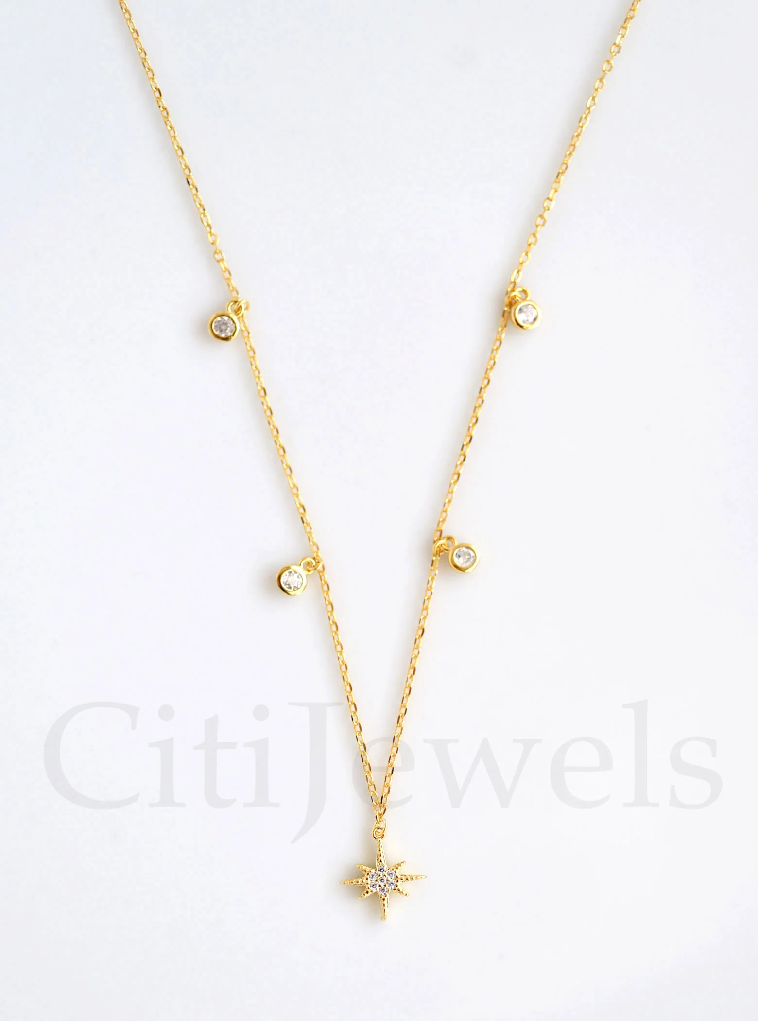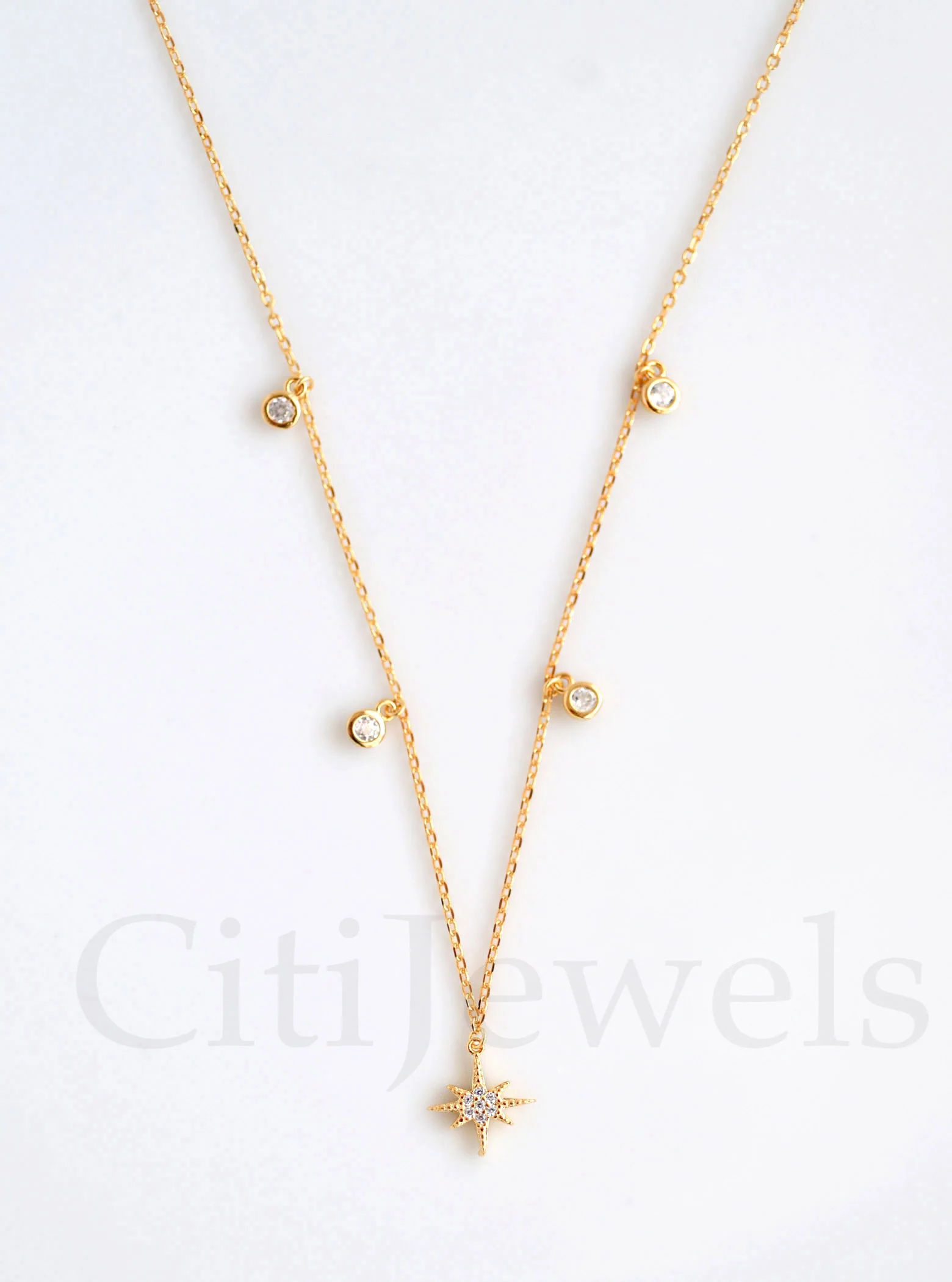 Starburst w/ Multi-Dangle CZ Necklace IN 16-18″ ADJUSTABLE . AVAILABLE IN YELLOW GOLD VERMEIL, ROSE GOLD VERMEIL OR BLACK RHODIUM