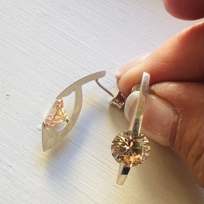 Sterling Silver 10mm Champagne CZ earrings , post back measure 1.25” in length are high polished in front and matte finish on sides. Made in Warsaw Poland