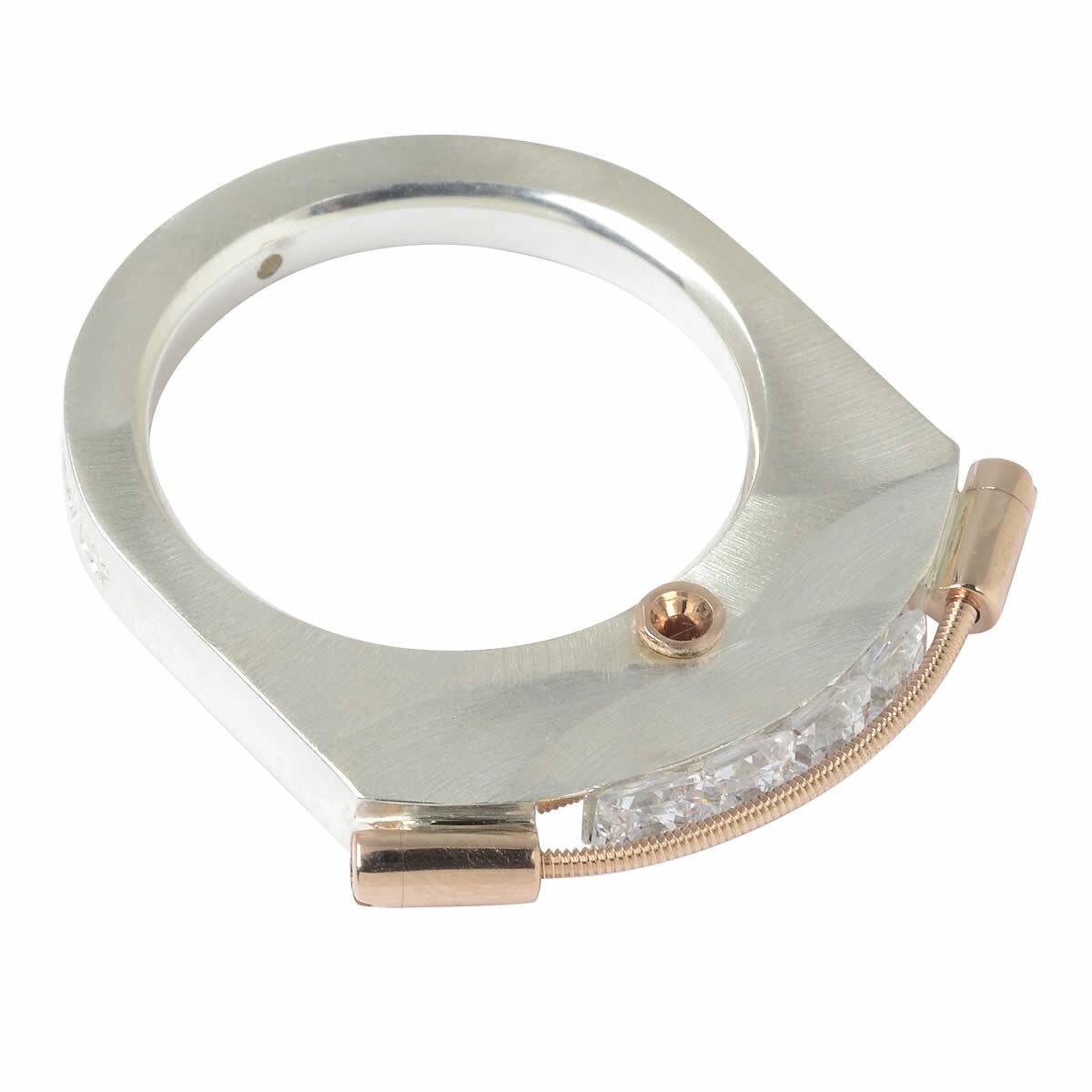 STERLING SILVER AND 14K GOLD PRINCESS CUT RING WITH PRINCESS CUT STONES. BAND HAS A MOSAIC MATTE FINISH