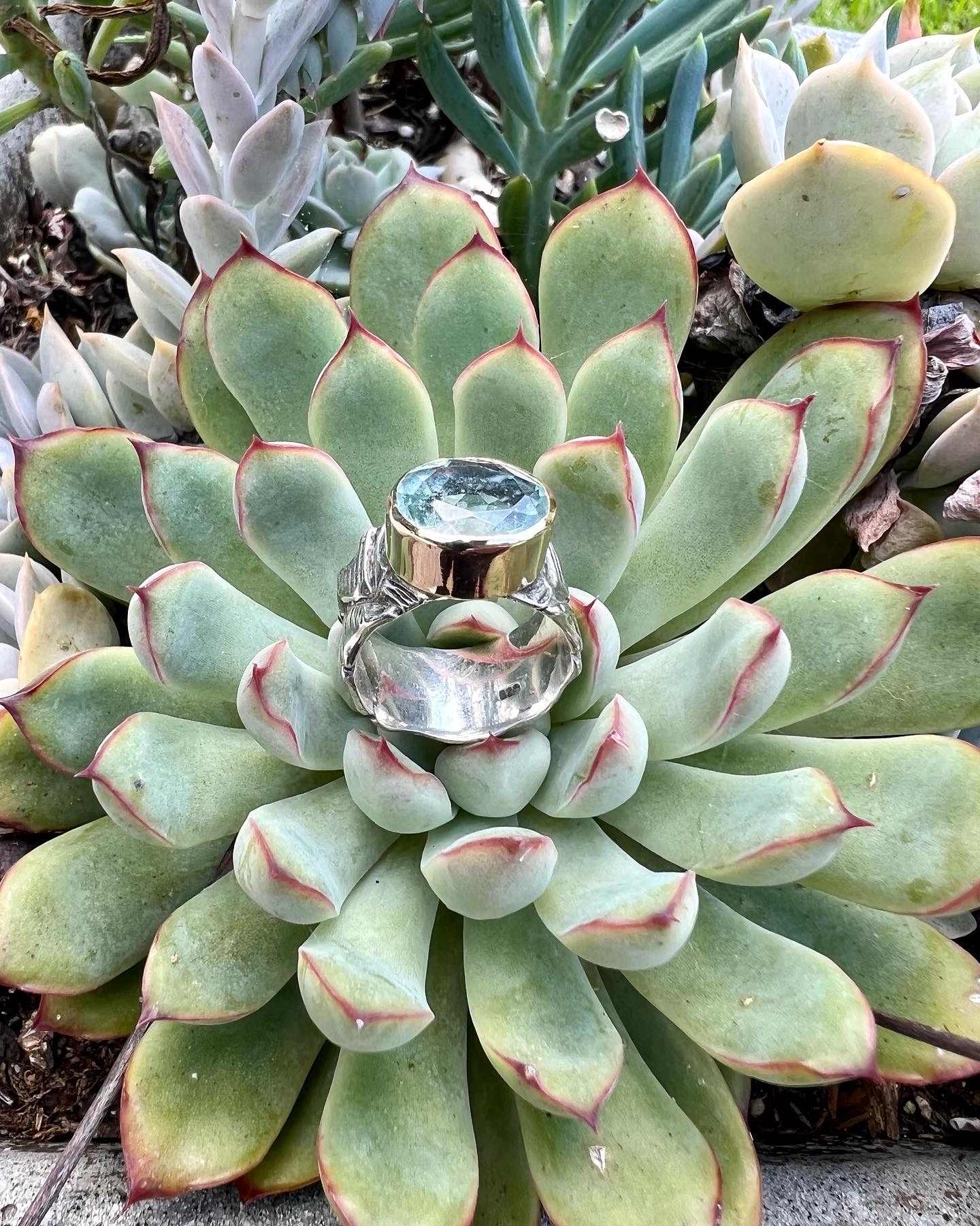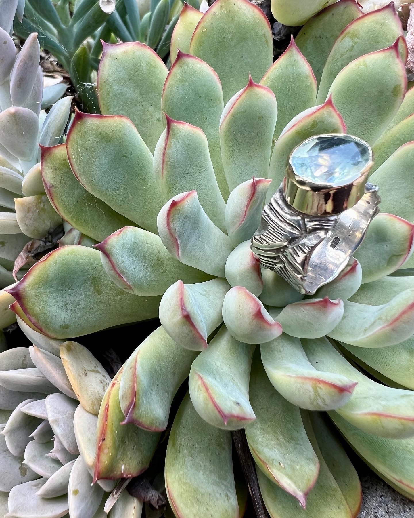 STERLING SILVER TEXTURED BAND WITH GOLD BEZEL AND BEAUTIFUL OVAL BLUE TOPAZ. RING IS WIDE SO IF YOU ARE A SIZE 6, THIS SIZE 7 WILL FIT YOU WELL.