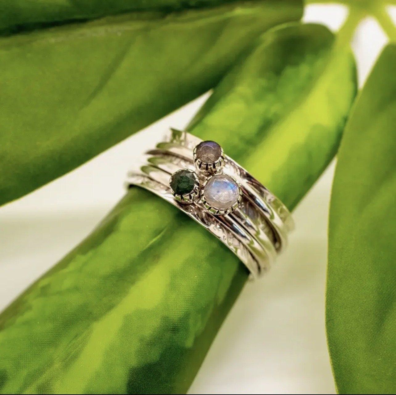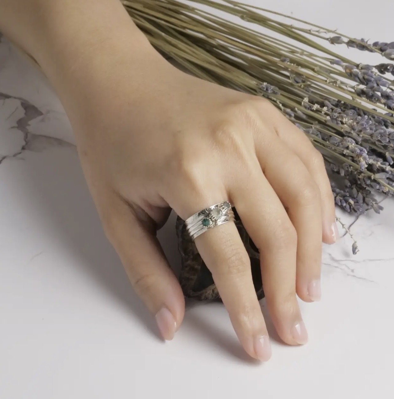 Sterling Silver Spinner Ring with three stones moonstone, emerald and Labradorite