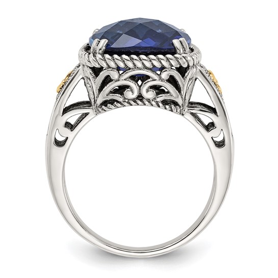 Sterling Silver with 14k Antiqued Lab Created Checker Cushion Sapphire Ring