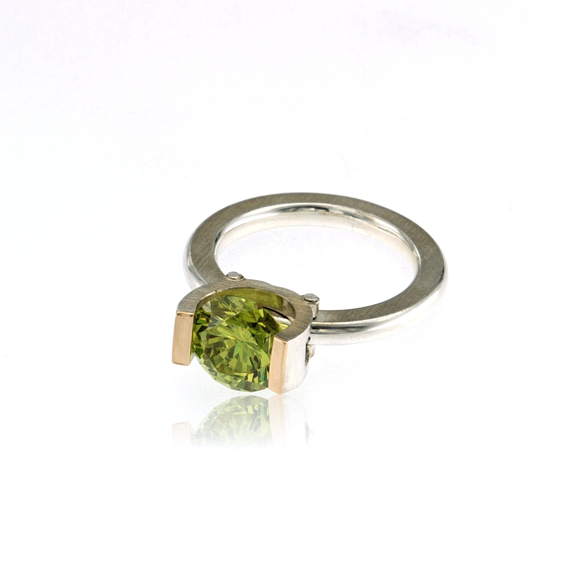 RING SILVER 14K GOLD 9mm PERIDOTÂ CZ TENSION SET, MATTE FINISH