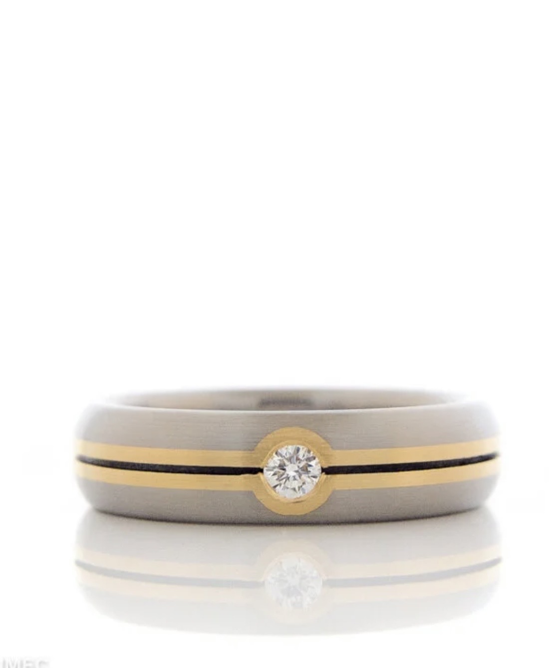 “TWO TONE W/CENTER STONE & GROOVE” 6MM HALF ROUND BAND BY JERRY SPAULDING