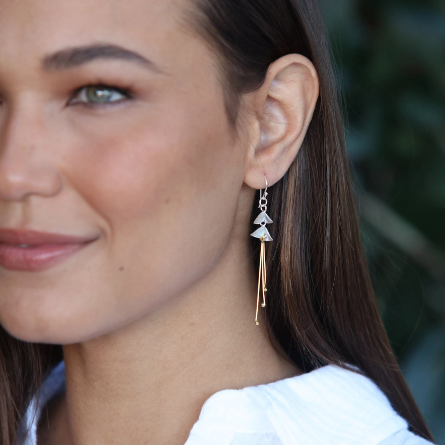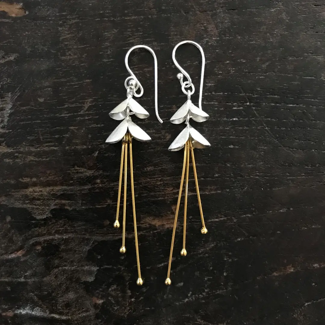 Sterling and vermeil earrings are handmade using fine quality sterling and an overlay of 22k gold. These are delicate, artistic pieces which need to be worn with care. Approximately 7 cm long