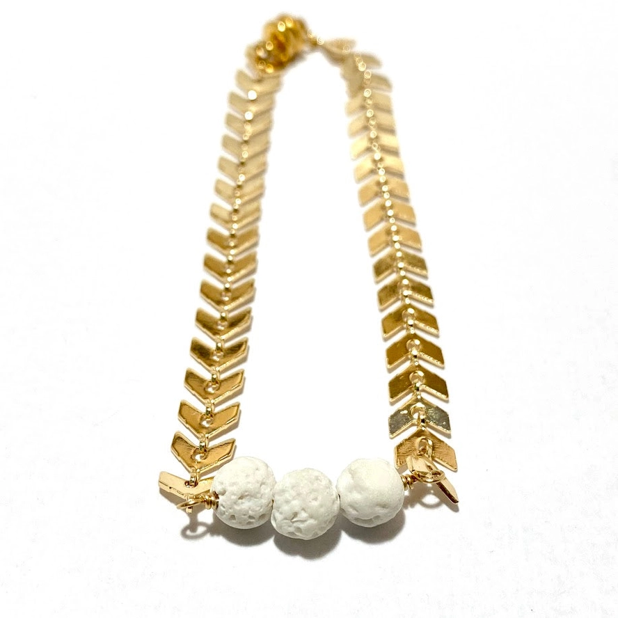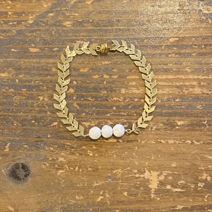 This aromatherapy bracelet with an extra strong magnetic clasp comes on gold plated ivy chain with white lava rocks. The lava stones are porous and allow you to put a drop of essential oil or perfume on and act as an aromatherapy diffuser.