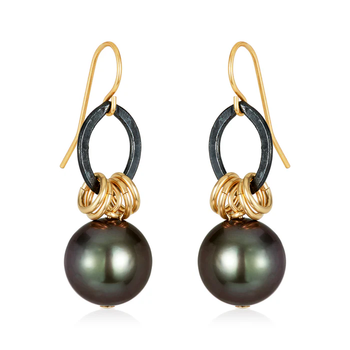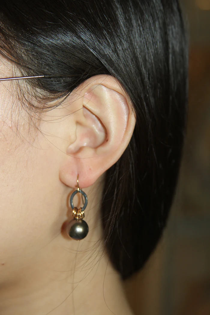 Oxidized sterling silver ovals with south sea pearl drop and gold-filled accent rings